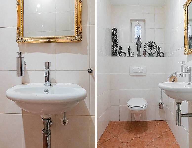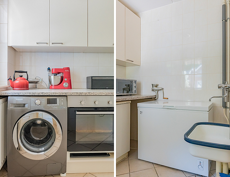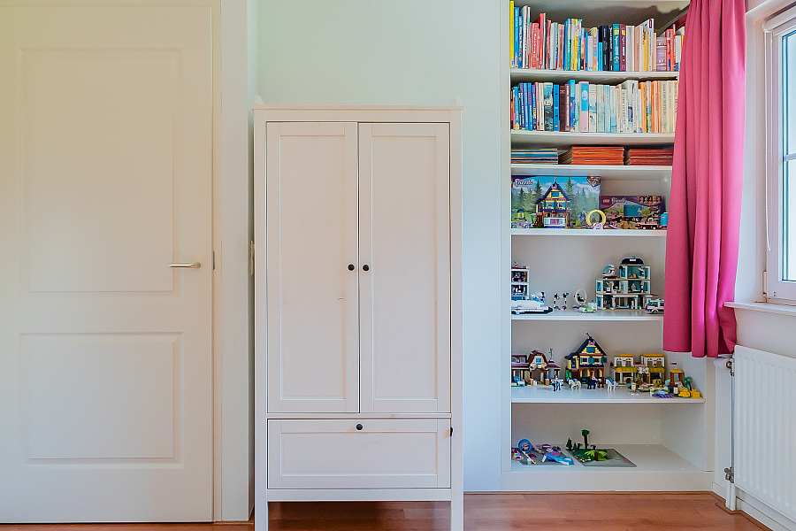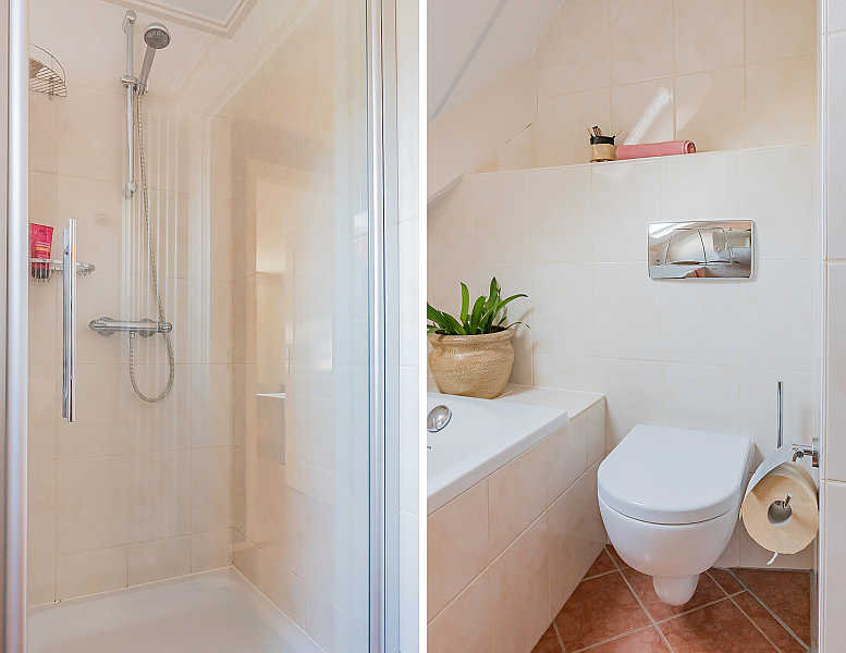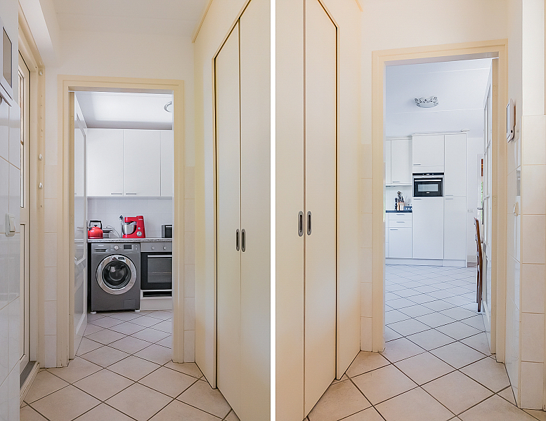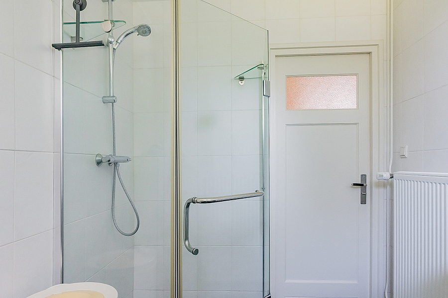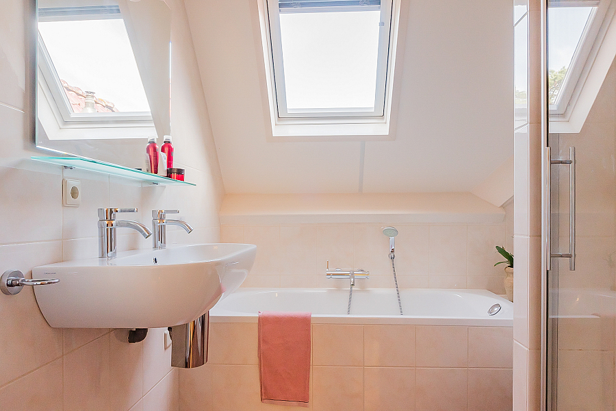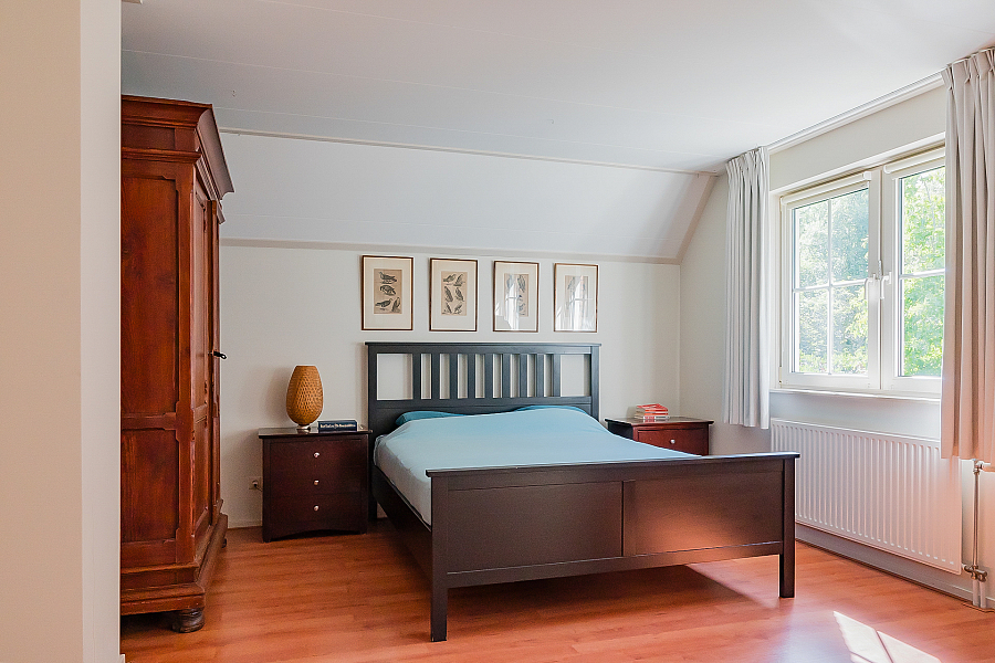 1e verdieping: overloop, berging en stookruimte, badkamer met ligbad, douchecabine, dubbele wastafel en toilet, 3 slaapkamers, waarvan 1 met vaste kast .