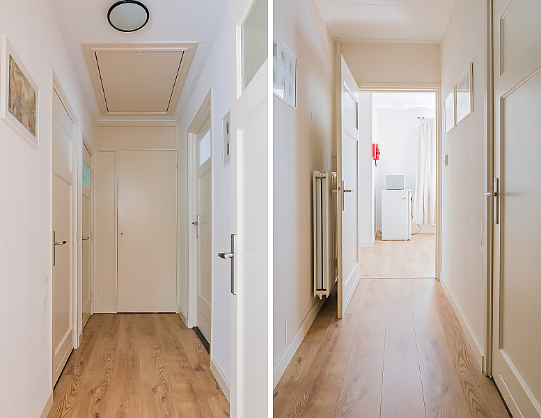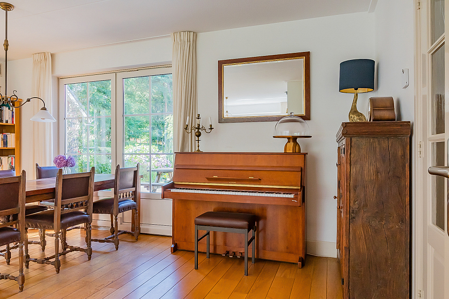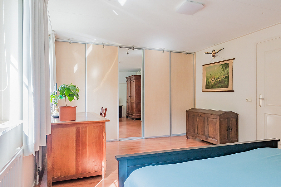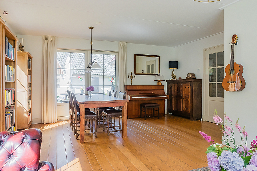 Begane grond: entree, ruime hal met vide, toilet met fontein, werk-/slaapkamer met mogelijkheid voor een badkamer, ruime en lichte woonkamer met massieve houten parketvloer, sfeervolle gashaard en schuifpui, woonkeuken, portaal, bergkast, grote bijkeuken met aansluiting voor wasmachine,
