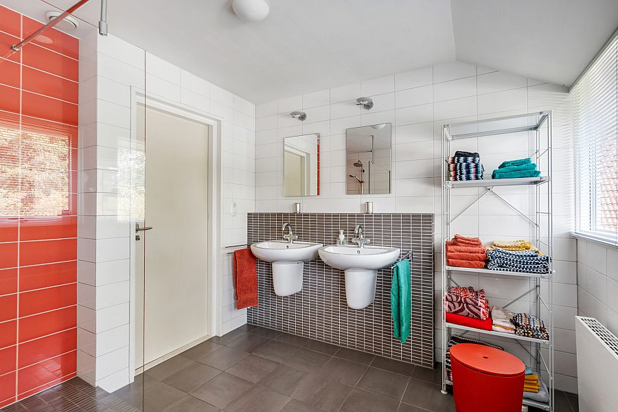 Op de 1e verdieping bevinden zich drie slaapkamers en een ruime badkamer met inloopdouche, toilet, bidet en dubbele wastafel. Daarnaast is er nog een extra kamer die doorloopt naar een vierde slaapkamer boven de garage. Deze ruimte kan uitstekend gebruikt worden als werkplek of speelkamer. Op de 2e verdieping is er een ruime bergzolder.