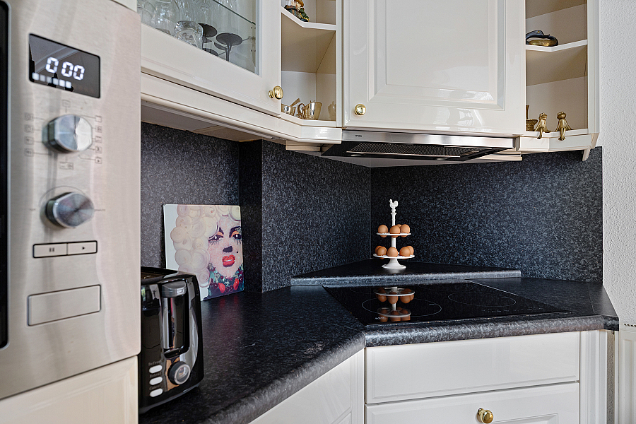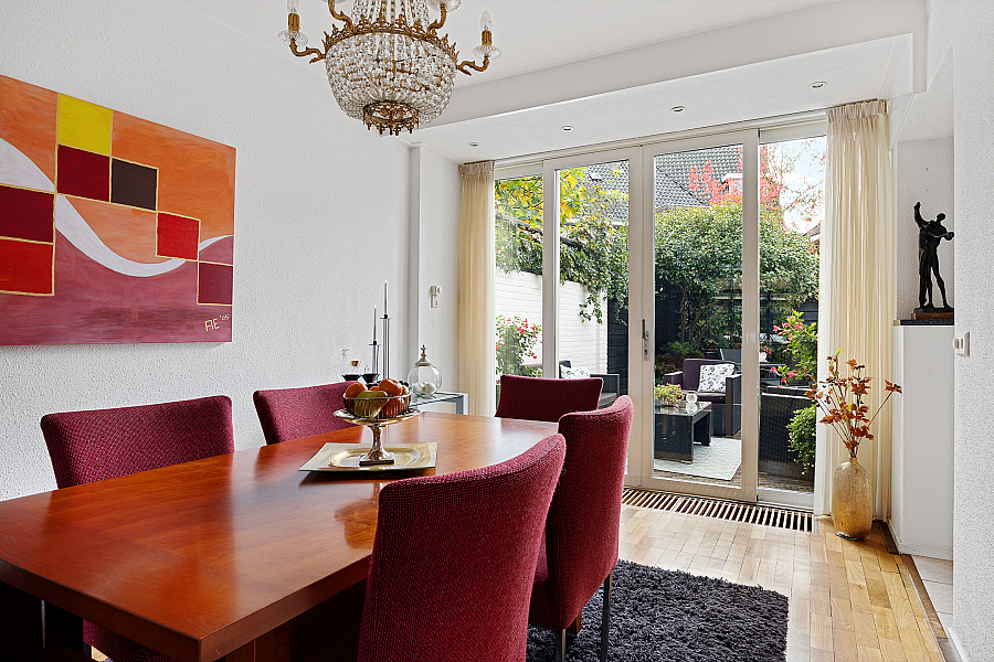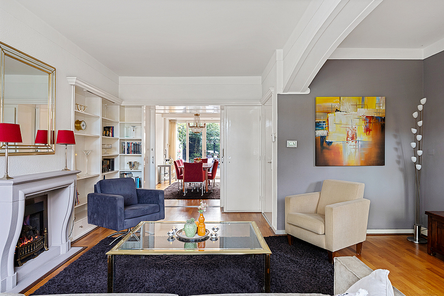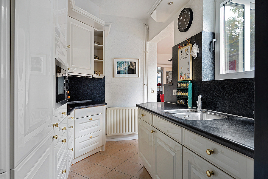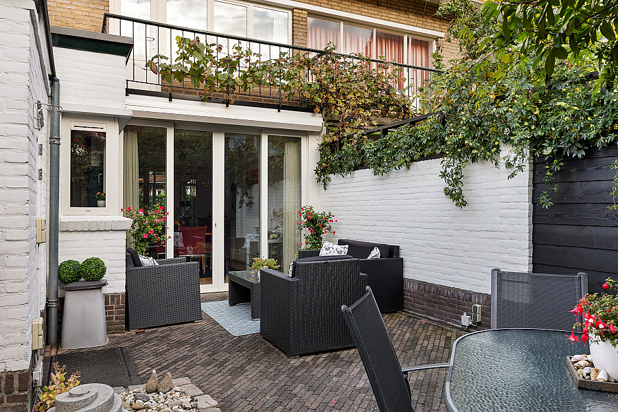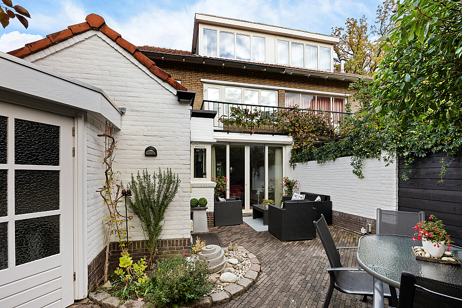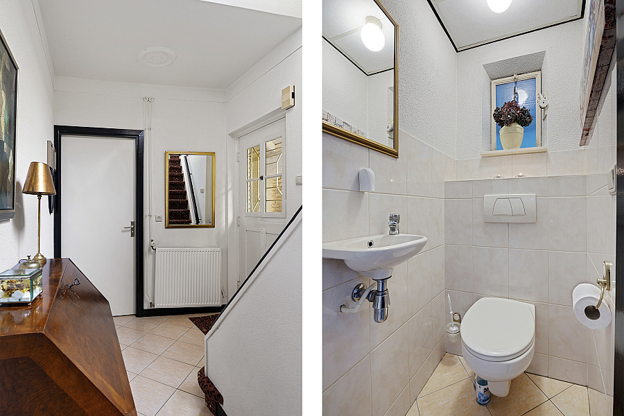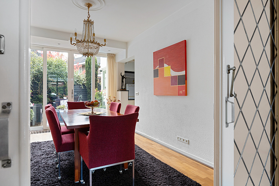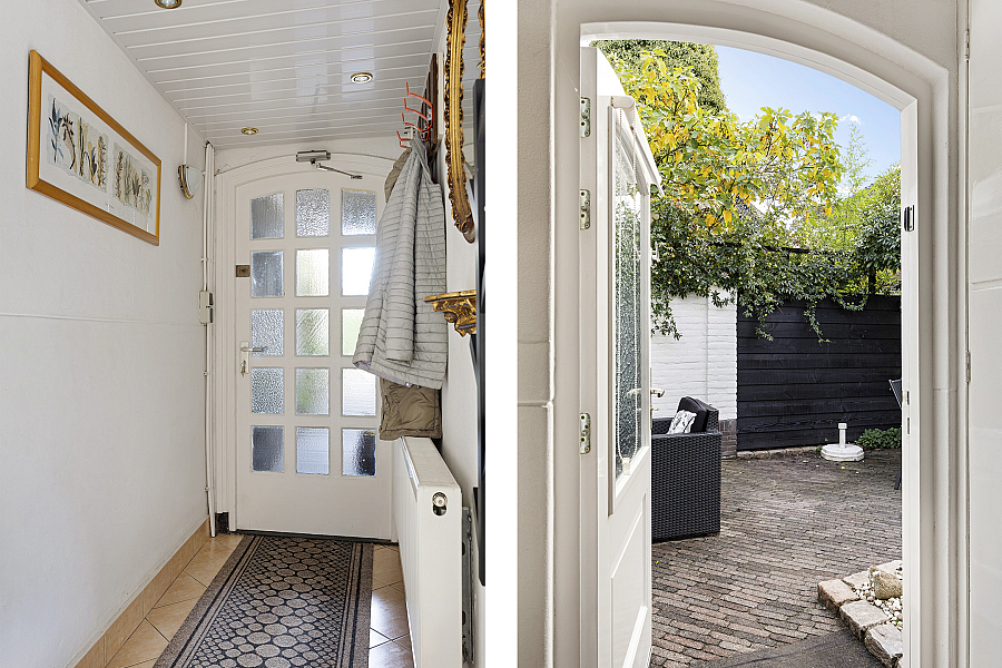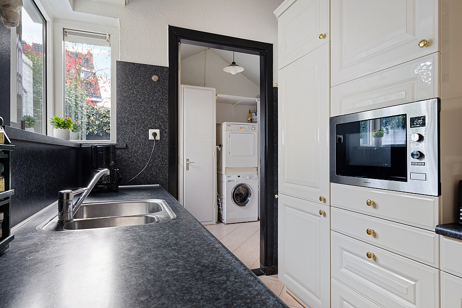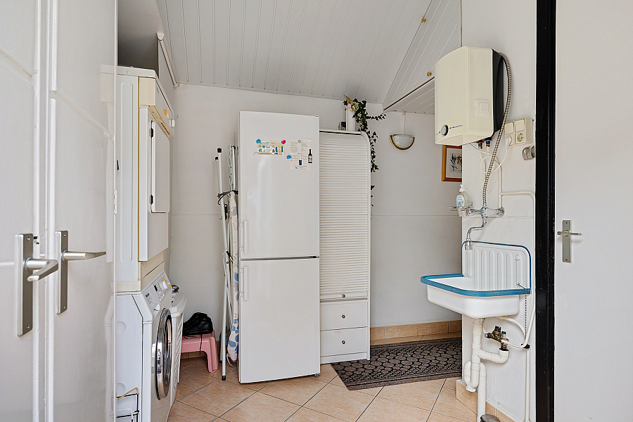 Achter de charmante gevel schuilt een verrassend ruime woning met een prettige indeling. De woonkamer en eetkamer staan in open verbinding met elkaar, maar behouden dankzij de en-suite deuren hun eigen karakter. De schuifpui brengt veel licht naar binnen en verbinden de woonkamer met het zonneterras. De half open keuken is voorzien van inbouwapparatuur, en in de bijkeuken vind je de witgoedaansluitingen, een wastafel en extra bergruimte.