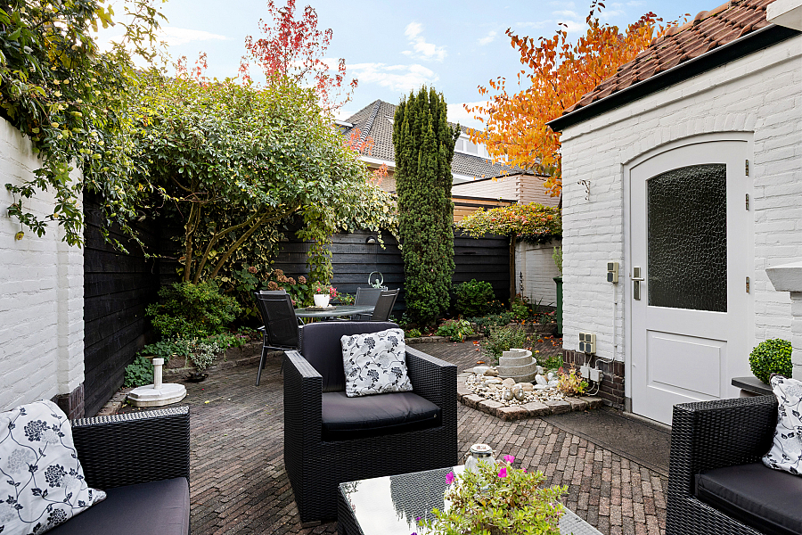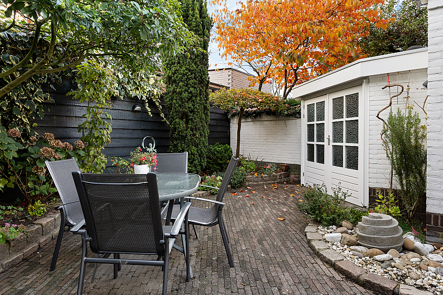De achtertuin is keurig aangelegd en biedt volop privacy. Achterin staat een praktisch tuinhuis met elektra; handig voor fietsen en gereedschap.