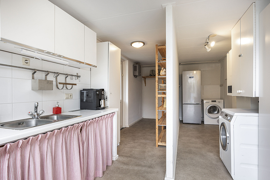 Begane grond: entree met garderobe en toilet. De zithoek in de lichte woonkamer is gericht op de straat en het groen; de eethoek grenst aan de patio. Aansluitend de dichte keuken met deur naar buiten. Verder treft u twee ruime bijkeukens/voorraad- en wasruimtes. De slaapkamer heeft een directe deur naar de badkamer met douche, wastafel en tweede toilet.