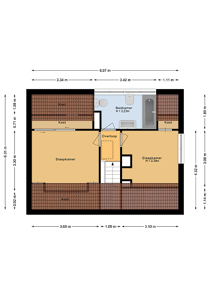 1e verdieping: overloop, twee slaapkamers met veel bergruimte achter de knieschotten, en een badkamer met ligbad en toilet.