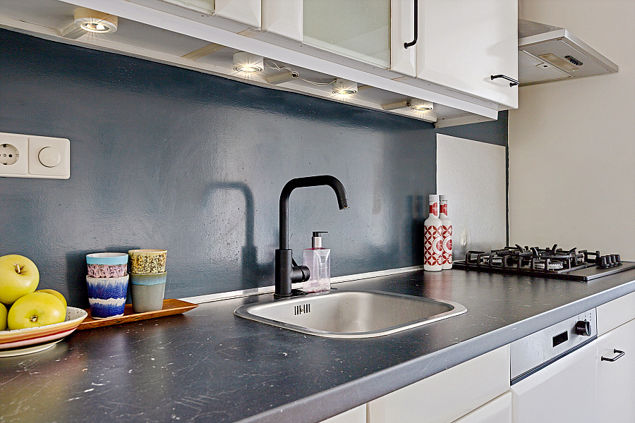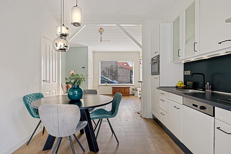 De woonkeuken met een langwerpig keukenblok is voorzien van de volgende inbouwapparatuur: wasbak, koelkast, vaatwasser, combi-oven, 4-pitsgaskookplaat en een afzuiger, daarnaast is er meer dan genoeg kastruimte aanwezig. Middels een achterdeur is de tuin te bereiken. Via de achtergelegen hal is het toilet en badkamer bereikbaar alsmede de trapopgang naar de eerste verdieping.