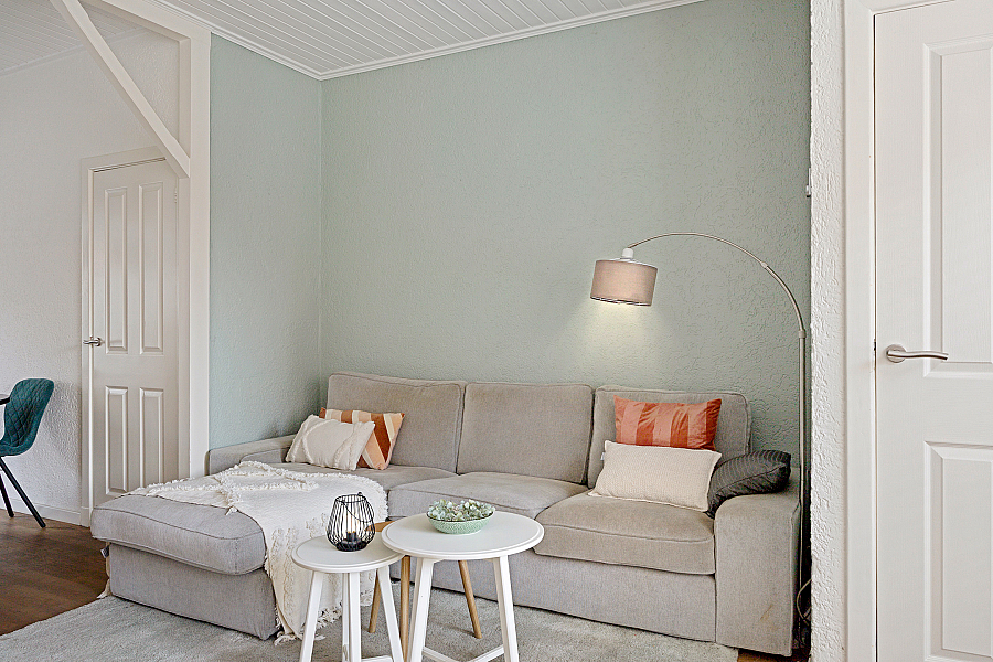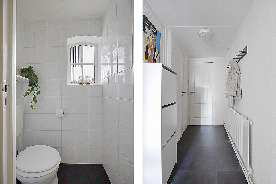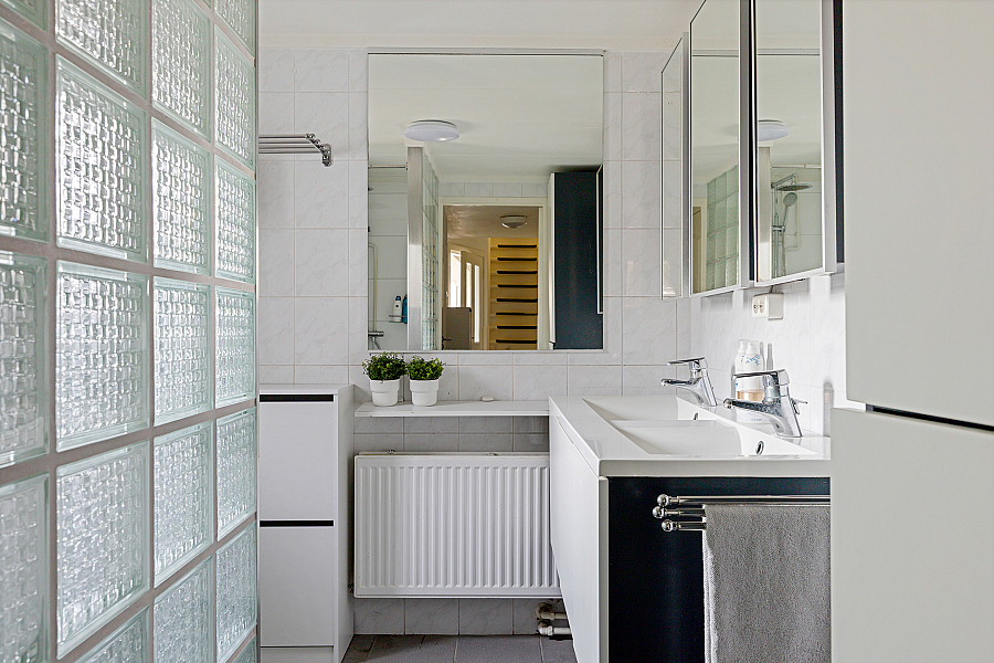 Bij binnenkomst op de begane grond word je verwelkomd door een mooie living. De ruimte heeft een aangename sfeer en door de grote ramen is er veel natuurlijk licht. Hier is ook de eerste badkamer met een inloopdouche en een wastafel.