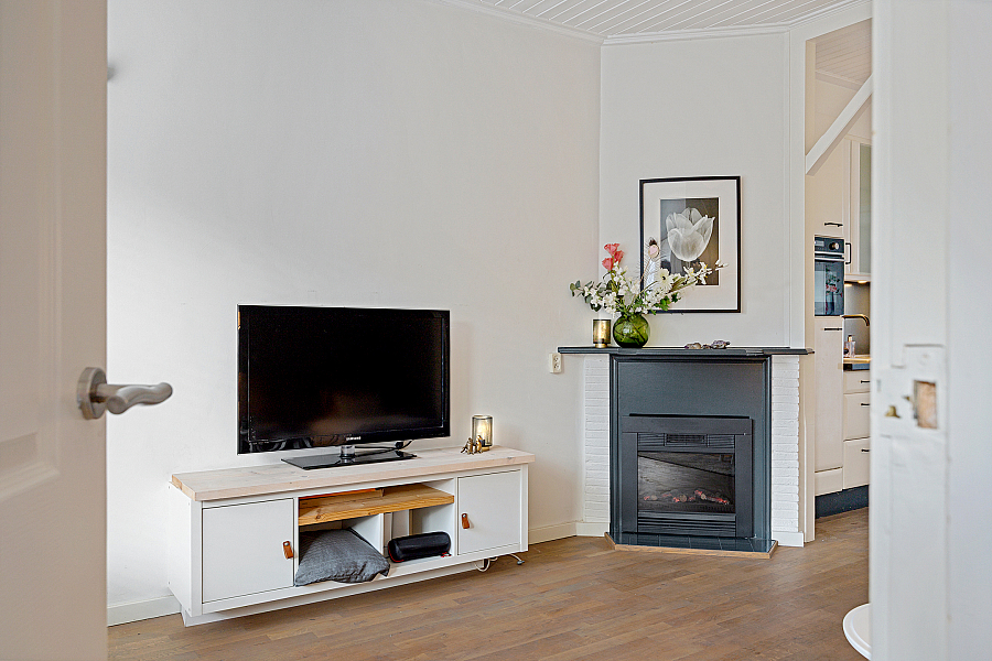 Riante woonkamer met een totale oppervlakte van 17 m², voorzien van een houten parketvloer en een heerlijk warme en knusse elektrische kachel.