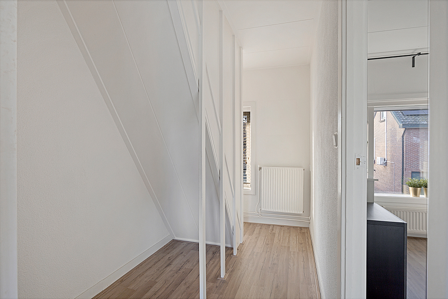 Overloop, en twee slaapkamers. De slaapkamers hebben een oppervlakte van respectievelijk ca 9 m² en ca 8 m² en zijn voorzien van houtenkozijnen met enkelglas. Deze verdieping is doorlopend voorzien van een fraaie houtlook laminaatvloer.