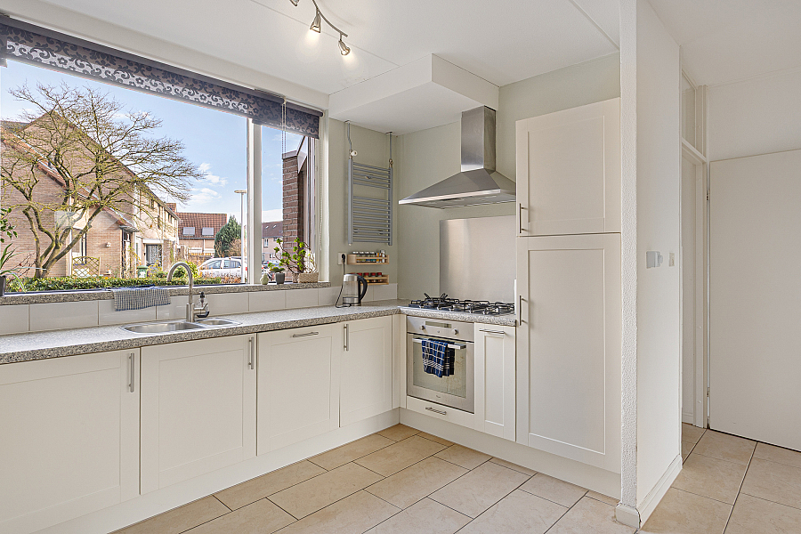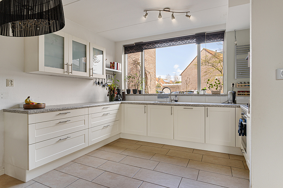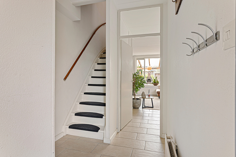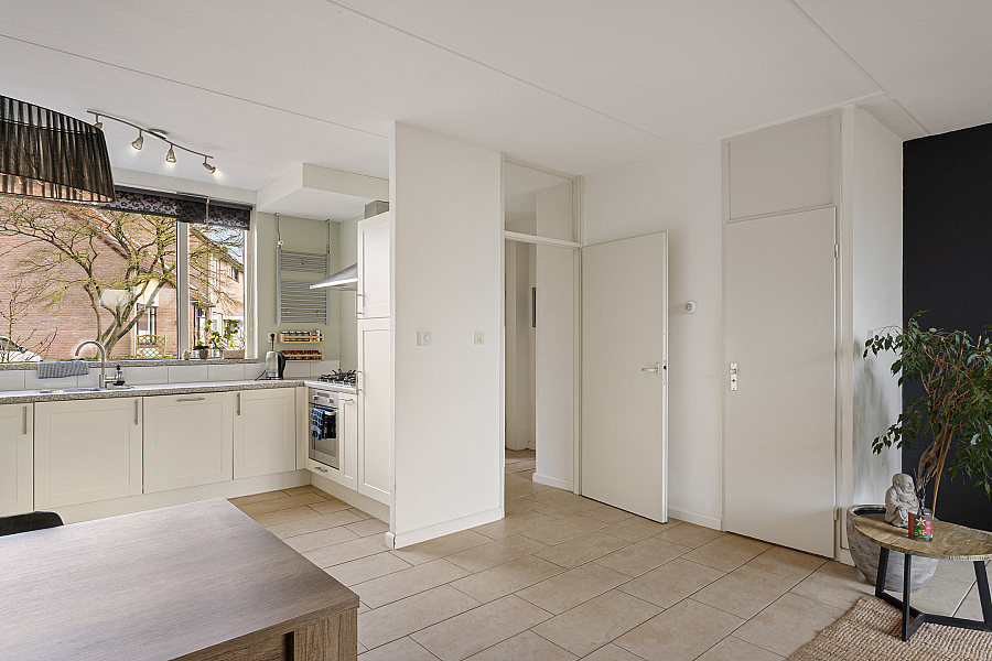 In de entree, een toilet, en een trapkast. De woonkamer voelt licht en ruim aan en biedt voldoende plek voor een gezellige zithoek en eethoek. De open keuken is voorzien van diverse inbouwapparatuur, waaronder een vaatwasser en oven, en deze sluit praktisch aan op de bijkeuken met toegang tot de tuin.