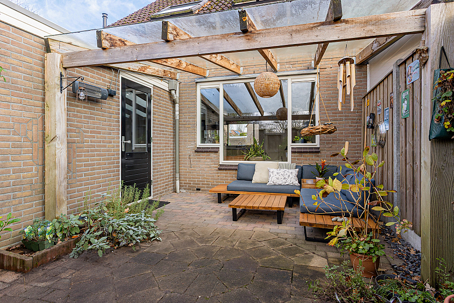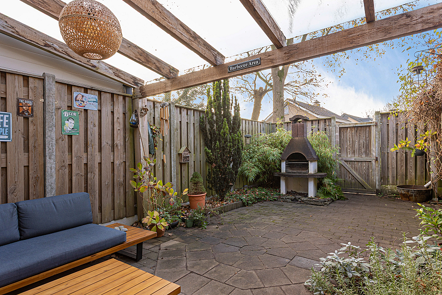 De achtertuin met achterom is verzorgd aangelegd en voorzien van twee overkappingen -ideaal voor een loungehoek, buitenkeuken of fietsenstalling. Dankzij de ligging aan een rustige straat en de mogelijkheid om op eigen terrein te parkeren, woon je hier comfortabel en praktisch.