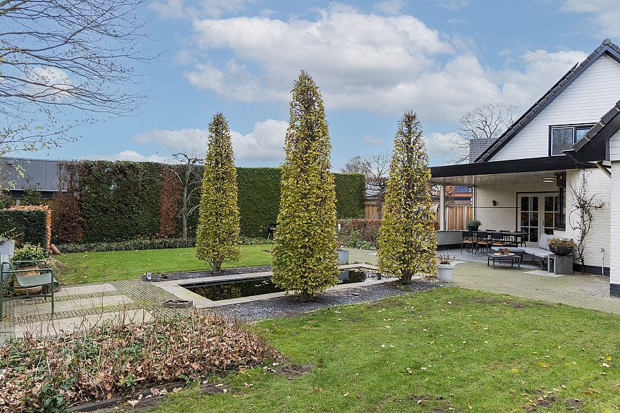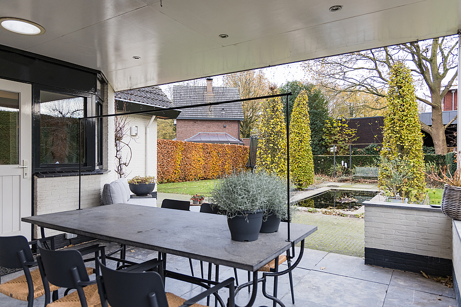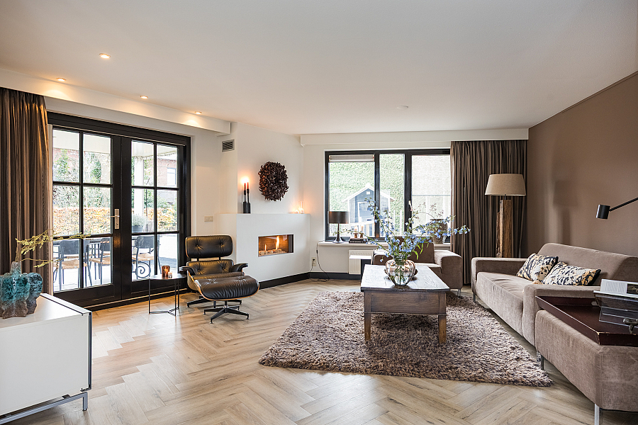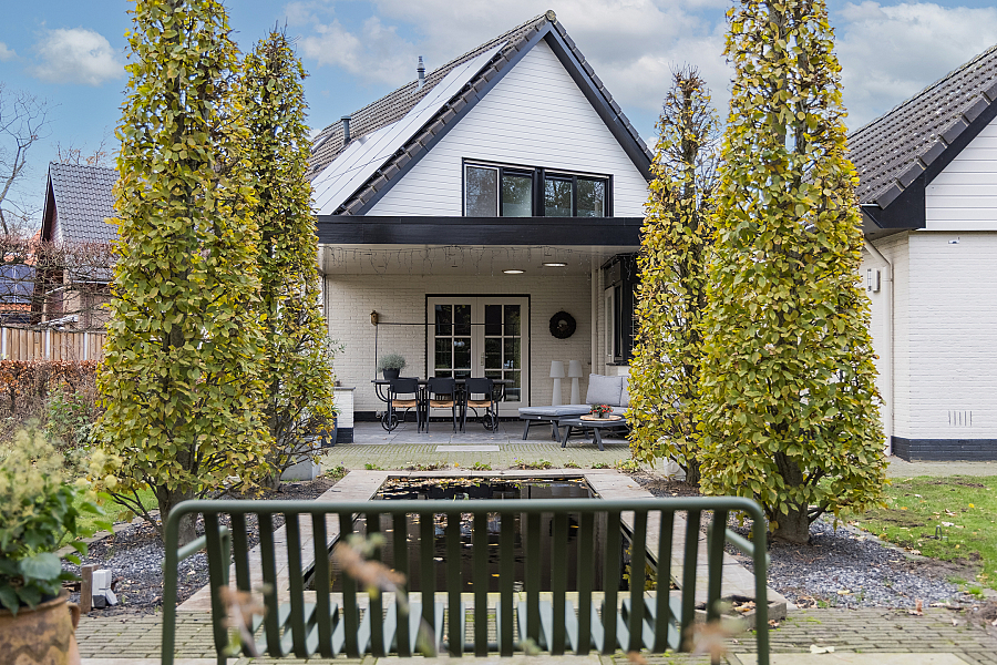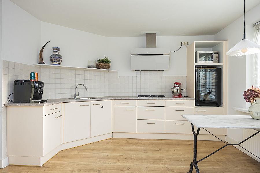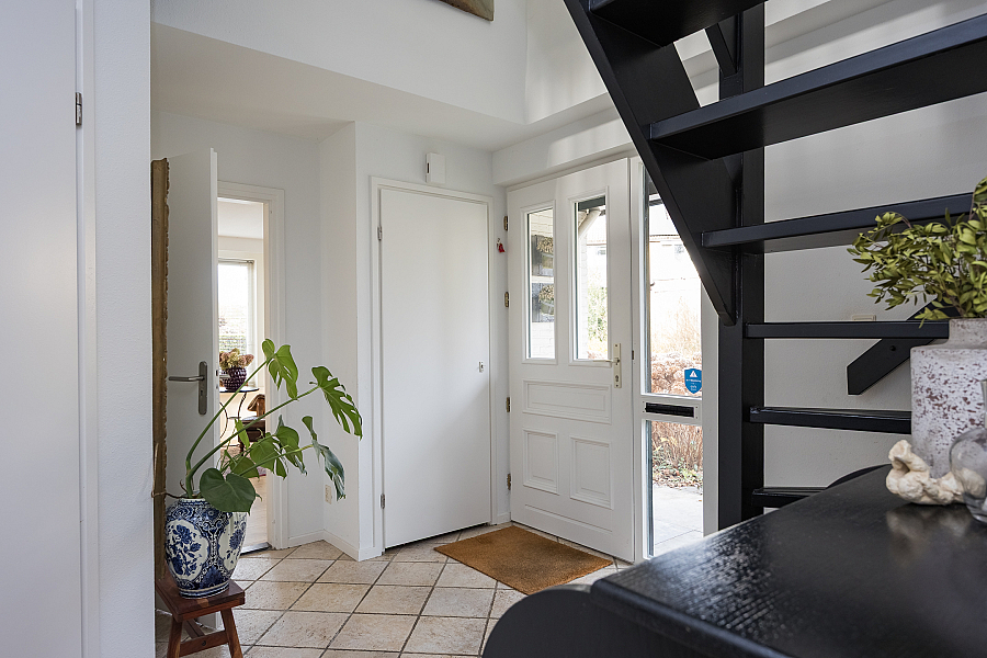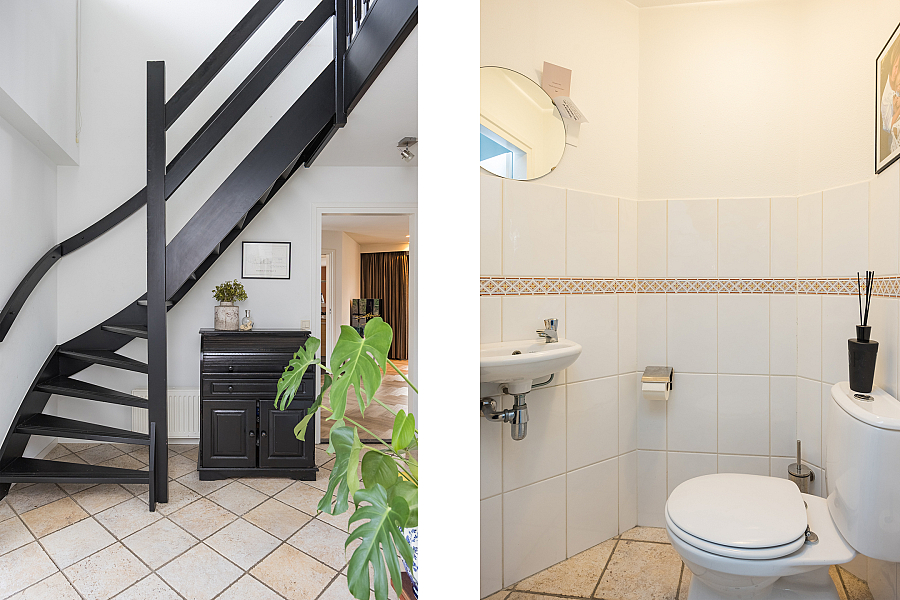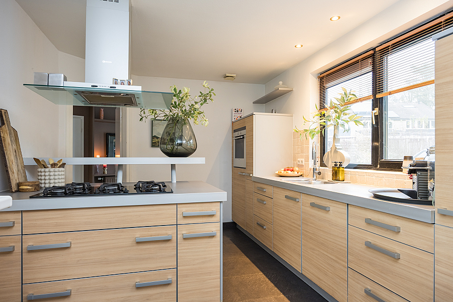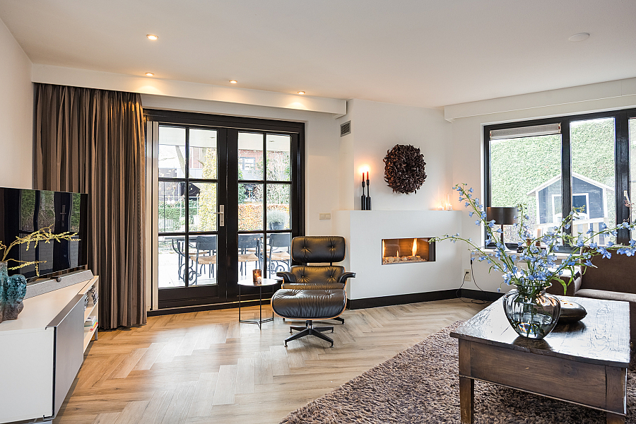 Via de royale entree betreed je de woning met een mooie hal voorzien van vide, wat direct een ruimtelijk en licht gevoel creëert. In de hal bevinden zich het toilet met fontein en de trapopgang naar de verdieping. De doorzonkamer is een sfeervolle leefruimte, licht aan beide zijden dankzij de grote raampartijen, en voorzien van openslaande deuren naar de tuin. De haard zorgt voor extra warmte en een gezellige ambiance. De woning beschikt daarnaast over een ruime woonkeuken, compleet met een kookeiland, veel kastruimte en natuurlijk alle benodigde apparatuur. (Dankzij de airco is het hier zowel in winter als zomer aangenaam vertoeven). Aangrenzend bevindt zich een bijkeuken met praktische inbouwkasten en extra bergruimte.