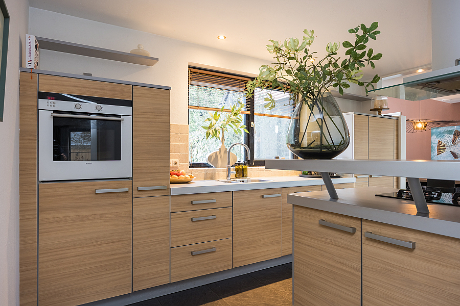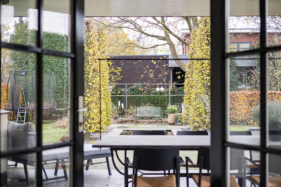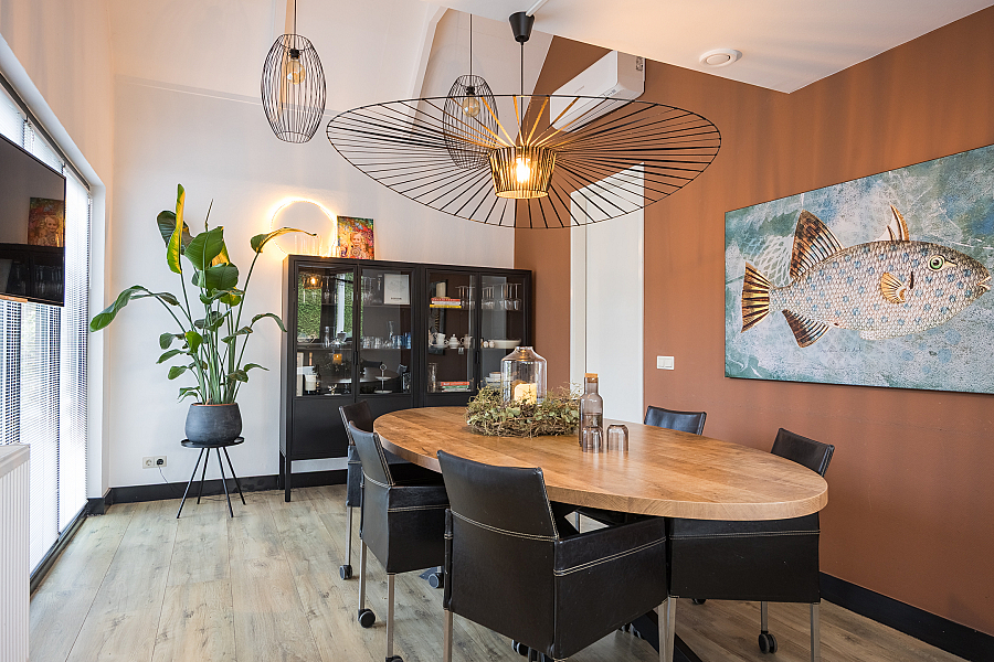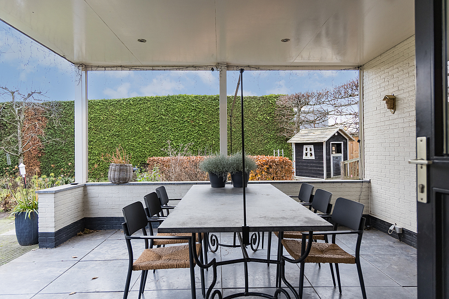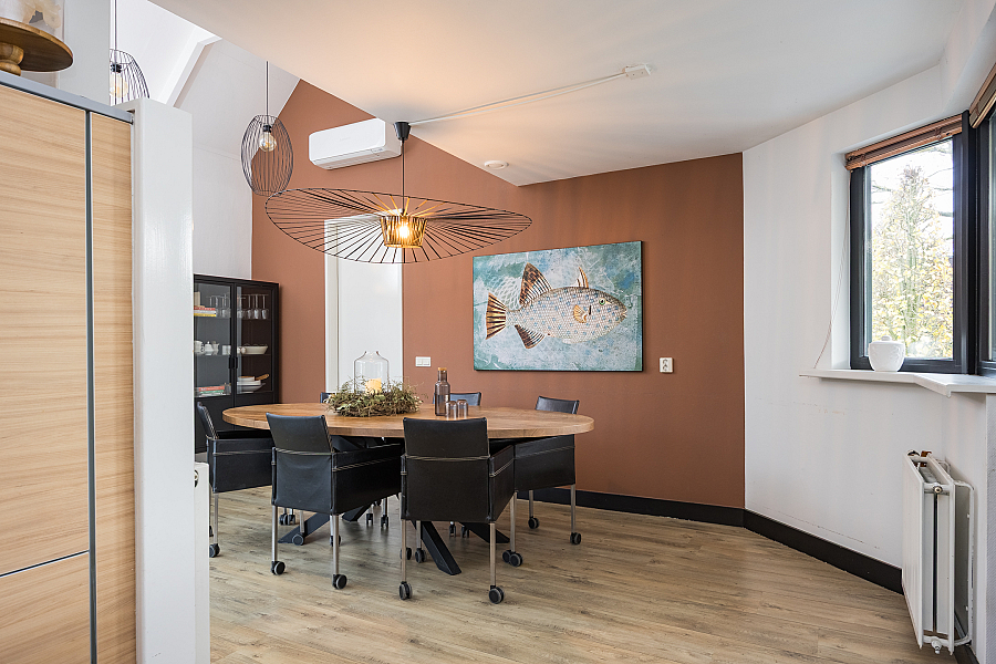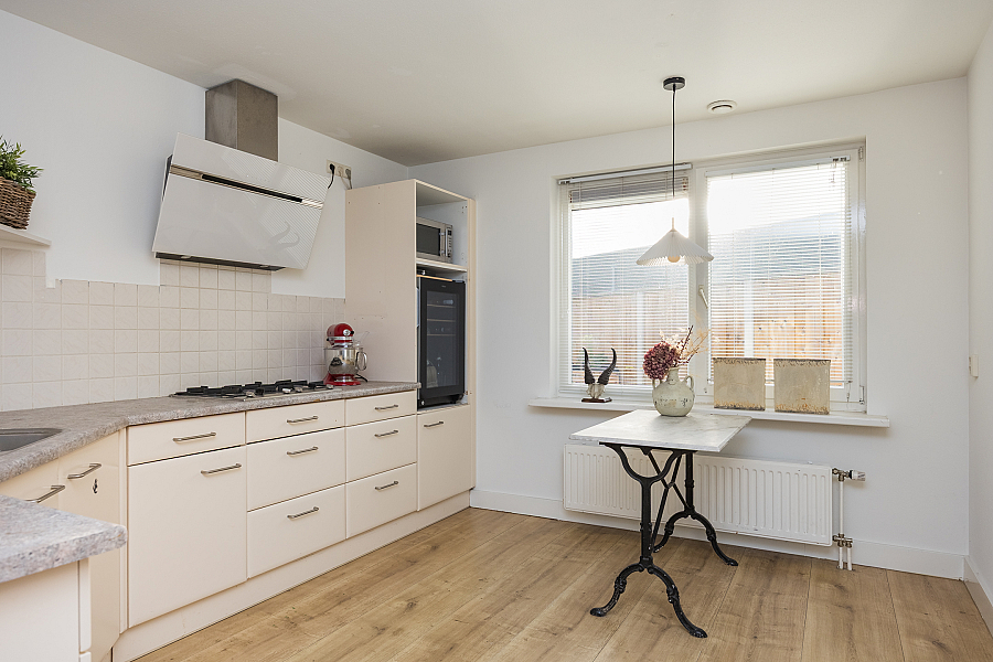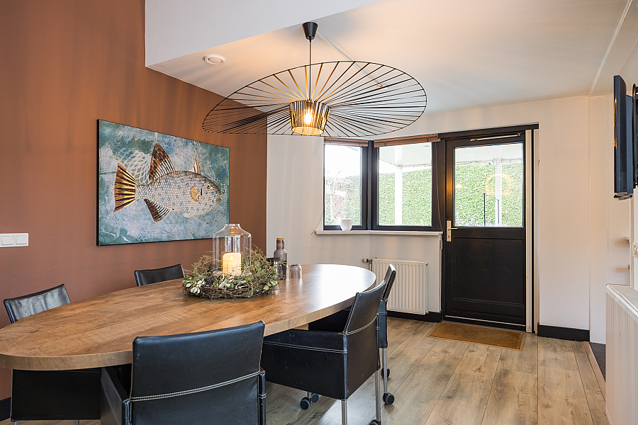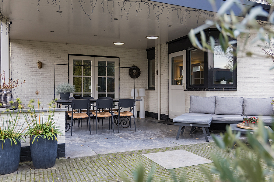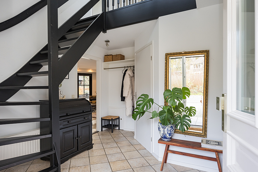 Via de royale entree betreed je de woning met een mooie hal voorzien van vide, wat direct een ruimtelijk en licht gevoel creëert. In de hal bevinden zich het toilet met fontein en de trapopgang naar de verdieping. De doorzonkamer is een sfeervolle leefruimte, licht aan beide zijden dankzij de grote raampartijen, en voorzien van openslaande deuren naar de tuin. De haard zorgt voor extra warmte en een gezellige ambiance. De woning beschikt daarnaast over een ruime woonkeuken, compleet met een kookeiland, veel kastruimte en natuurlijk alle benodigde apparatuur. (Dankzij de airco is het hier zowel in winter als zomer aangenaam vertoeven). Aangrenzend bevindt zich een bijkeuken met praktische inbouwkasten en extra bergruimte.