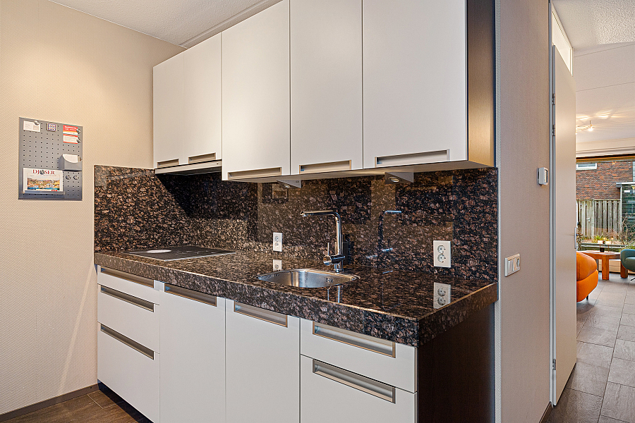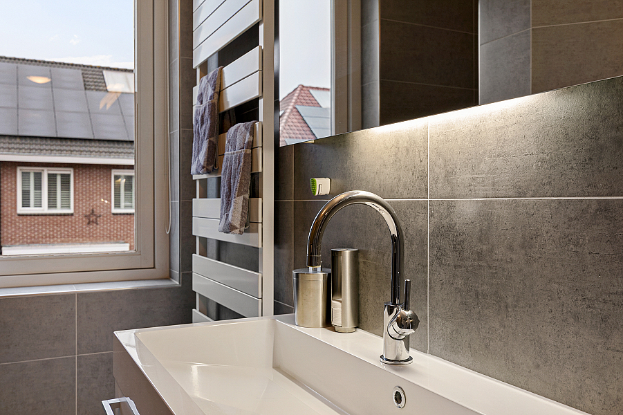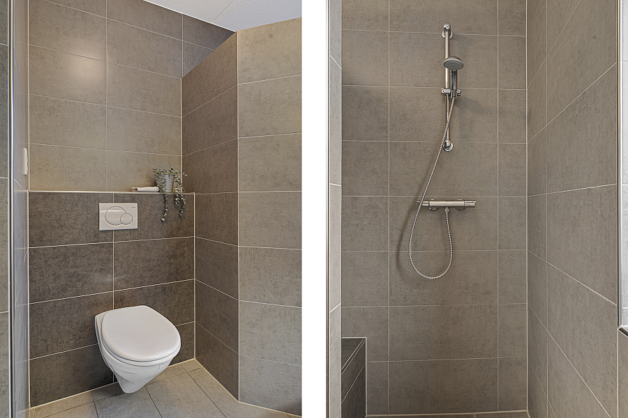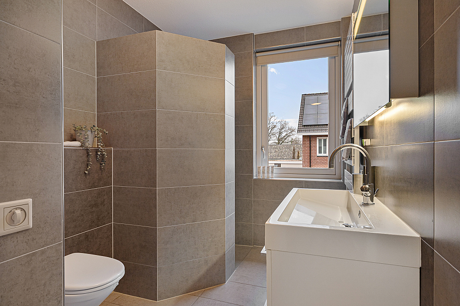 * Met vloerverwarming in woonkamer en badkamer;