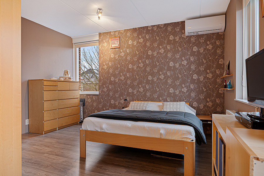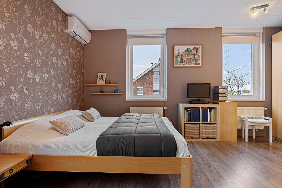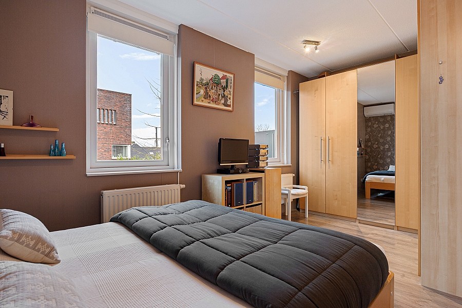 1e verdieping: overloop, hoofdslaapkamer (voorheen 2) met airco, 2e slaapkamer, badkamer met wastafelmeubel, douche, toilet en vloerverwarming.