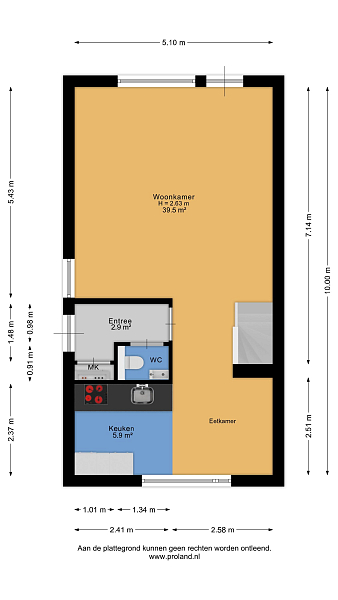 Begane grond: entree, hal, toilet, woonkamer met toegang naar het terras en een open keuken met eethoek