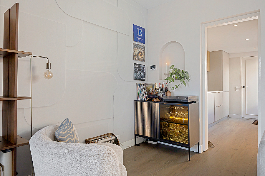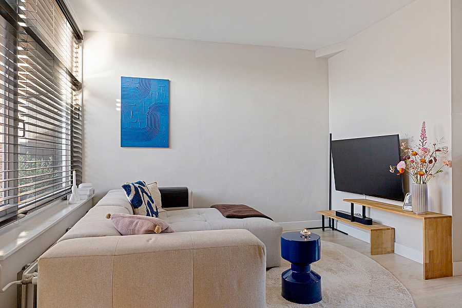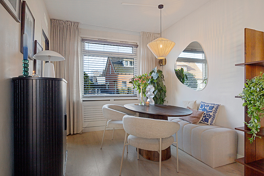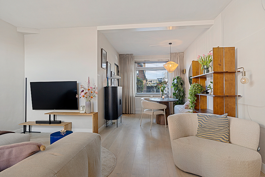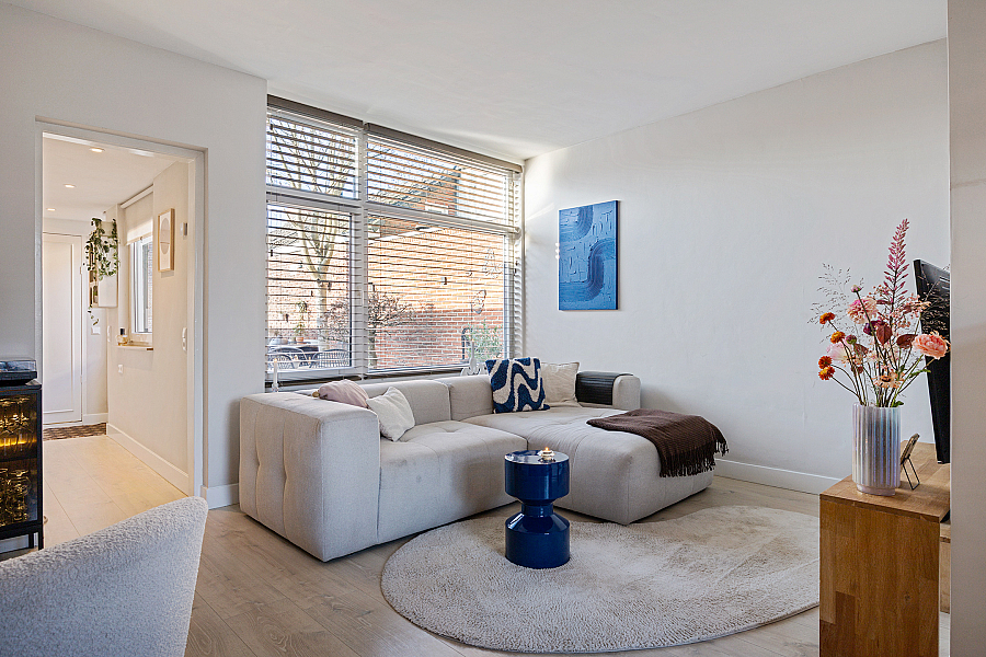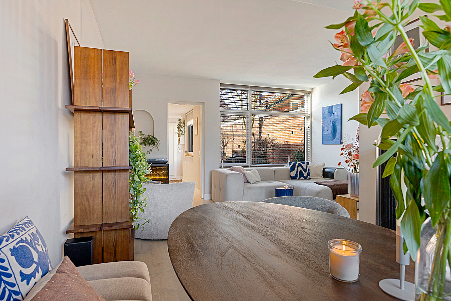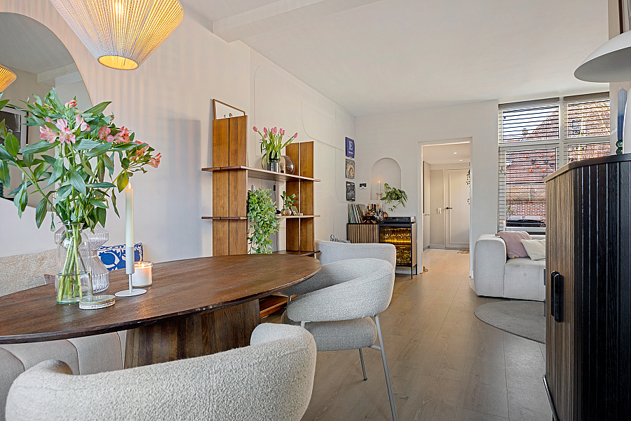 Bij binnenkomst proef je direct de sfeer die bij een woning uit 1926 hoort, gecombineerd met hedendaagse luxe. De L-vormige woonkamer is dankzij de grote raampartijen heerlijk licht. De woning is door de jaren heen voorzien van kunststof kozijnen met isolerende beglazing. Dat betekent: wel de authentieke uitstraling, maar niet het schilderwerk!