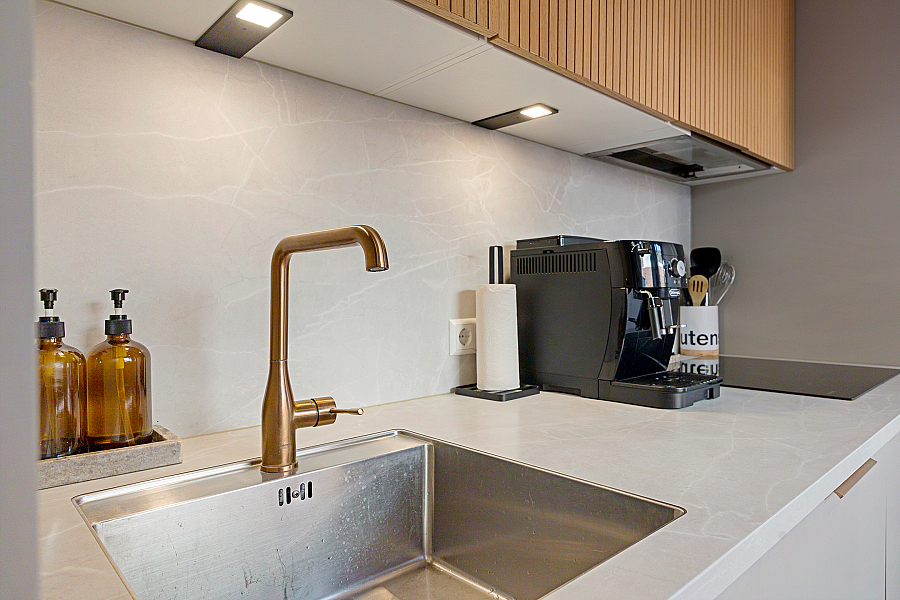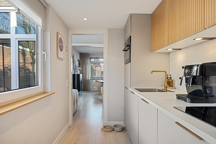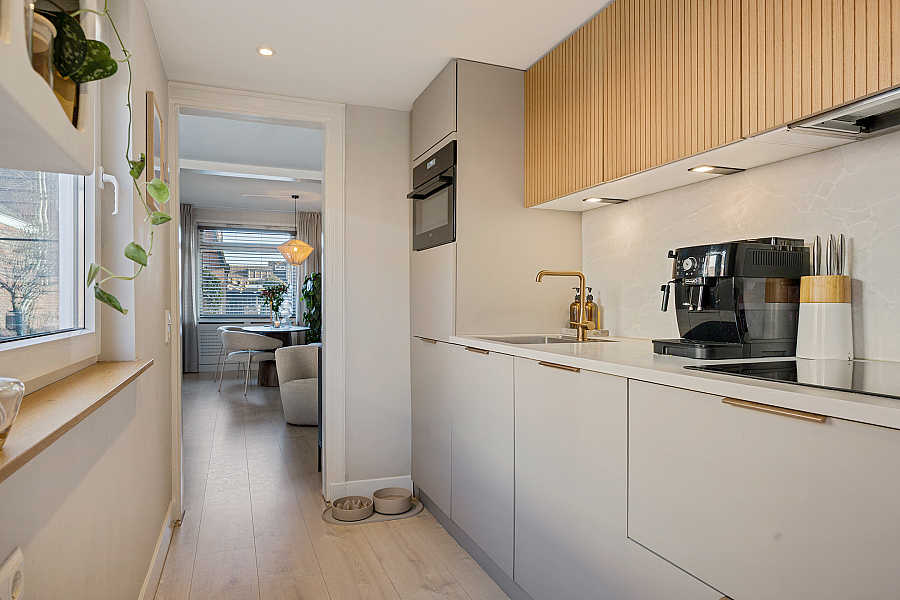 Tijdens de renovatie in 2023 zijn de ruimtes in huis optimaal benut. De mooie half open keuken is van alle gemakken voorzien, zodat je hier direct de sterren van de hemel kookt. Tevens is de vloer voorzien van elektrische vloerverwarming. Aansluitend vind je op de begane grond de badkamer.