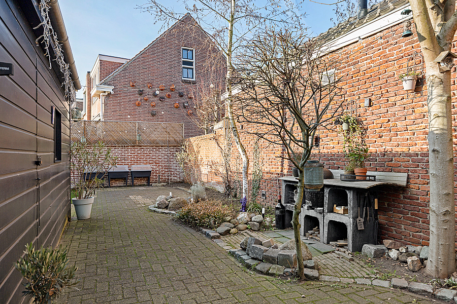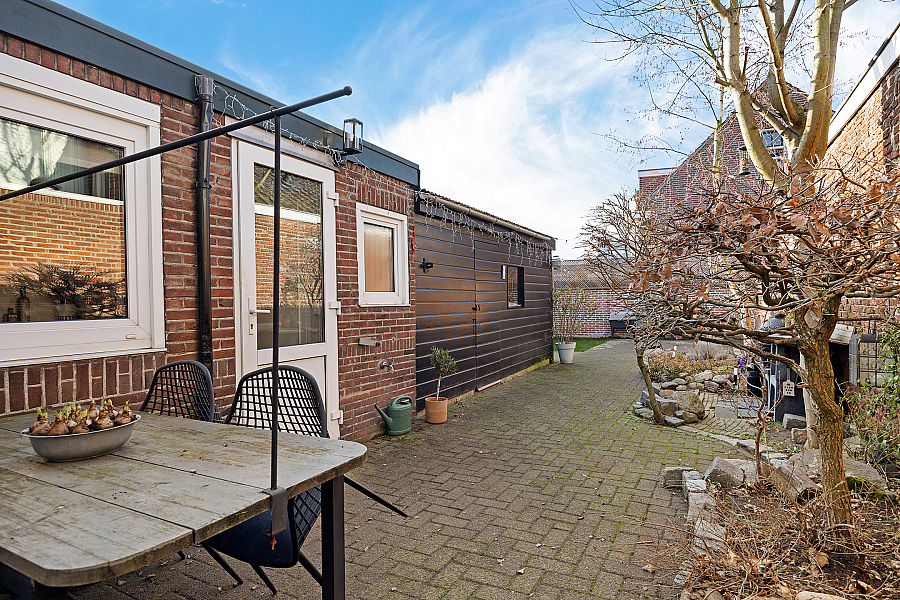En dan buiten: de tuin ligt op het gewilde westen. Dit betekent dat je na een dag werken heerlijk kunt genieten van de middag- en avondzon. Voor de hobbyist of klusser is dit perceel ook zeer welkom: met een royale berging heb je veel ruimte voor fietsen, gereedschap of een werkbank. Via de handige achterom ben je zo weer op pad.