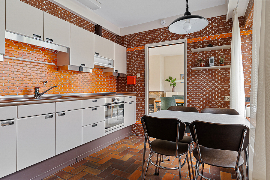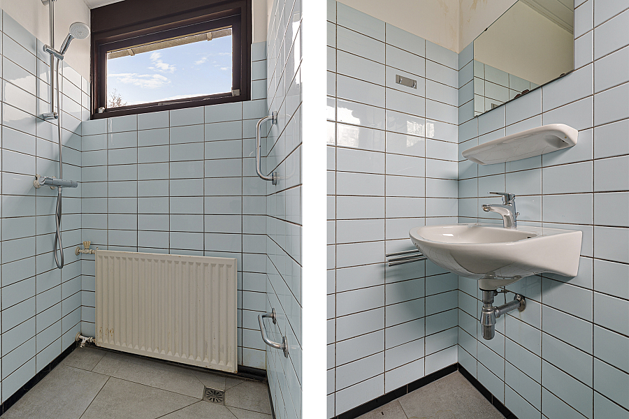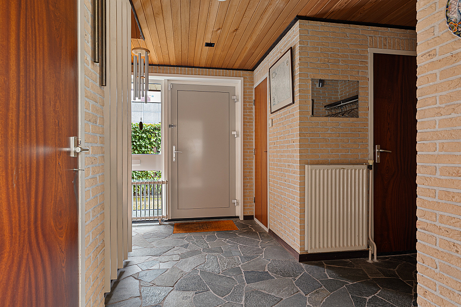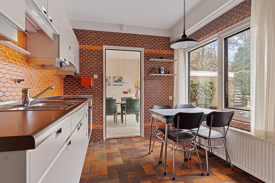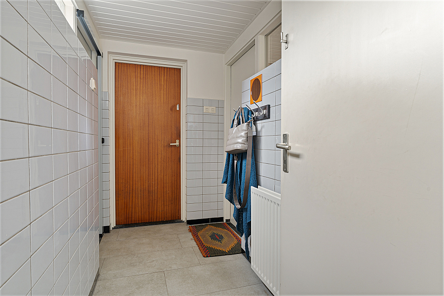 Via de entree kom je in de hal met toilet en kelder. De doorzonwoonkamer zorgt voor veel licht en een prettige sfeer. De dichte keuken sluit hier logisch op aan en biedt een goede basis om naar eigen wens te moderniseren. Via een achterhal kom je in de garage.
