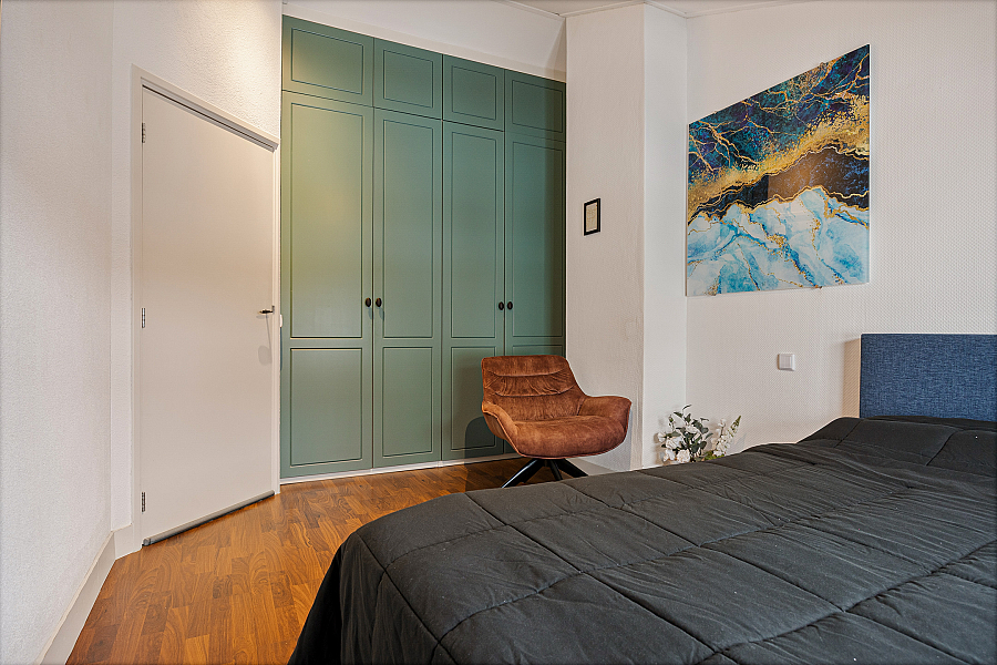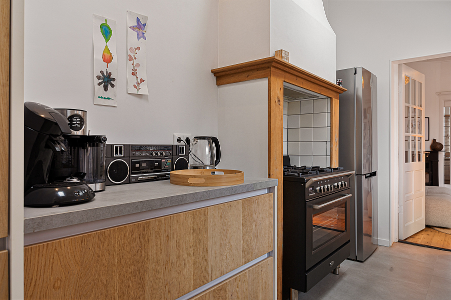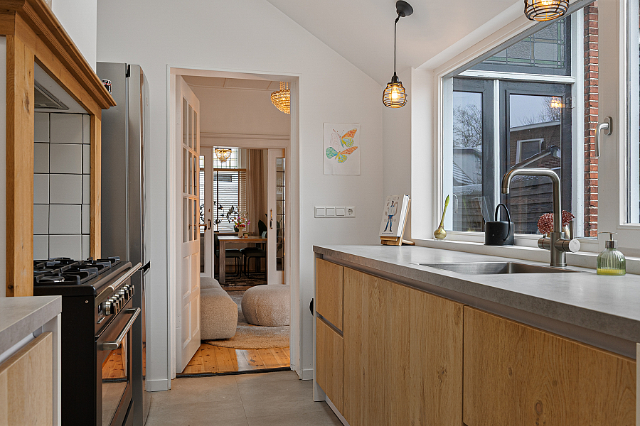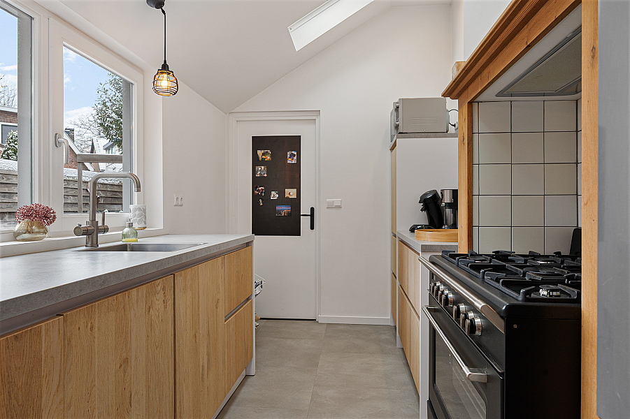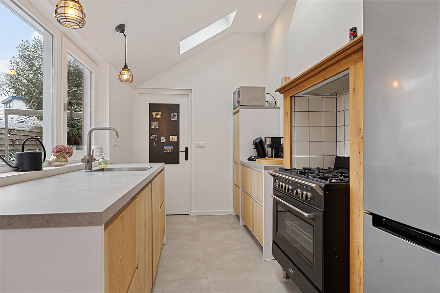 De dichte keuken is in 2018 vernieuwd en uitgevoerd met een stijlvolle pvc-vloer en moderne inbouwapparatuur. Denk aan een Boretti gasfornuis met grote oven, vaatwasser, heetwaterkraan en afzuigkap. Aansluitend vind je de ruime bijkeuken met aansluitingen voor wasmachine en droger en de cv-opstelling.