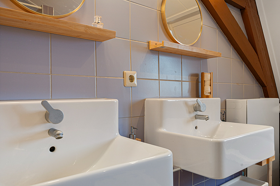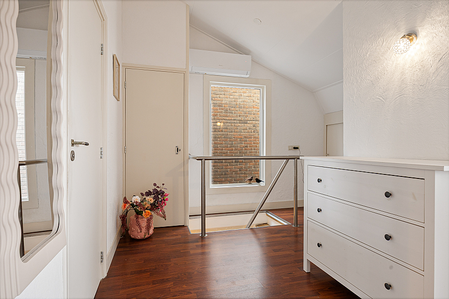 Op de eerste verdieping is een royale overloop met vaste kast en airconditioning. Vanaf hier bereik je twee comfortabele slaapkamers. De nette badkamer is compleet uitgevoerd met twee wastafels, een douchehoek, ligbad en toilet. Overloop en slaapkamers zijn afgewerkt met een laminaatvloer, wat zorgt voor een rustige en moderne uitstraling.