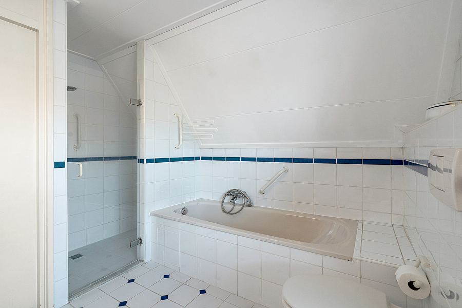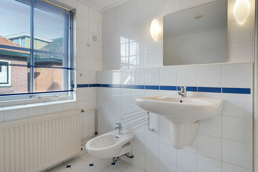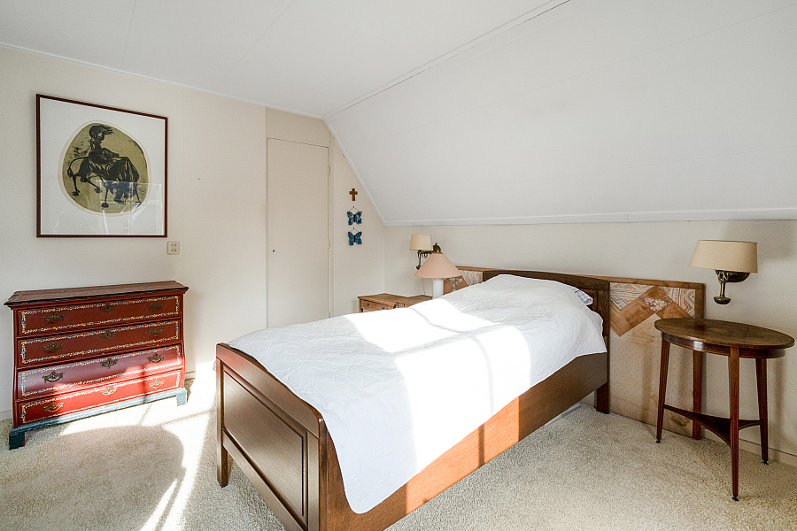 Overloop, was-/stookruimte, badkamer met wastafel, bidet, douche, toilet en ligbad, slaapkamer en grote slaapkamer met veel kastruimte (voorheen twee slaapkamers).