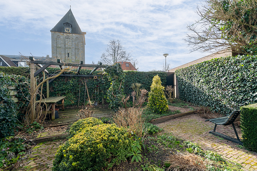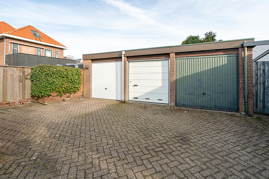 Besloten en zonnige tuin op het zuiden met achterom naar eigen garage achter de woning, extra parkeerplaatsen direct voor de deur.