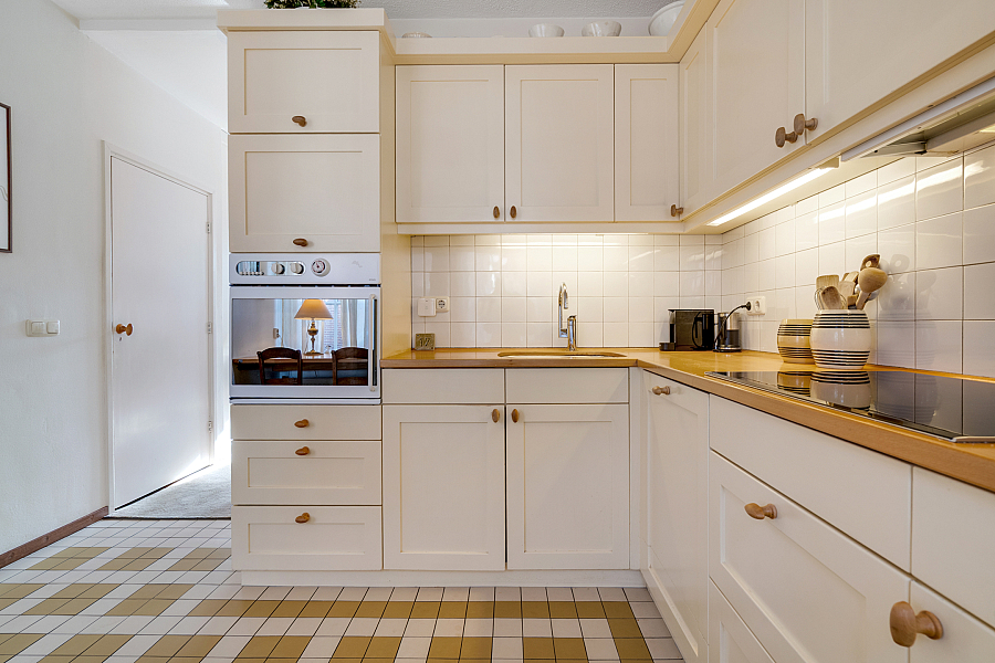 Hal met toilet, lichte woonkamer met eethoek en trapkast, half open keuken voorzien van koel-/vriescombinatie, oven, vaatwasser, afzuigkap en (vernieuwde) inductiekookplaat.