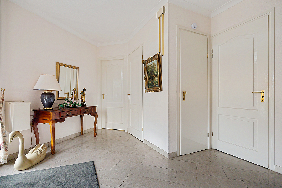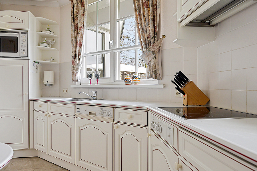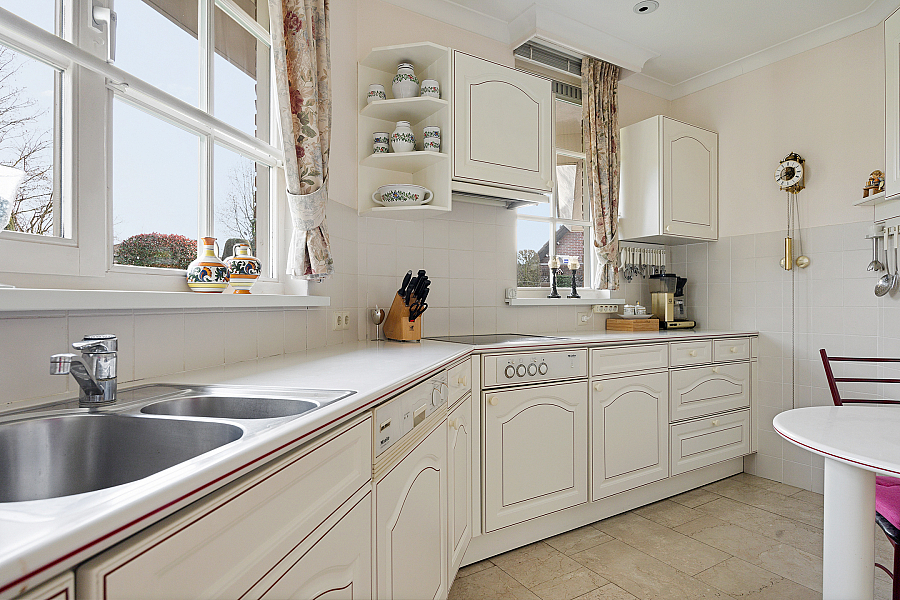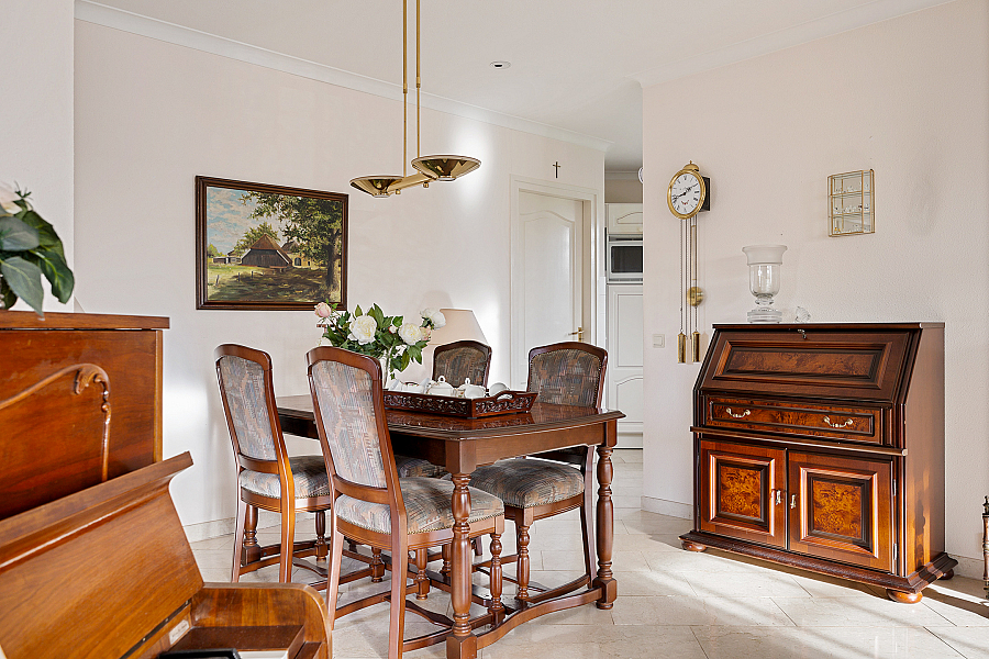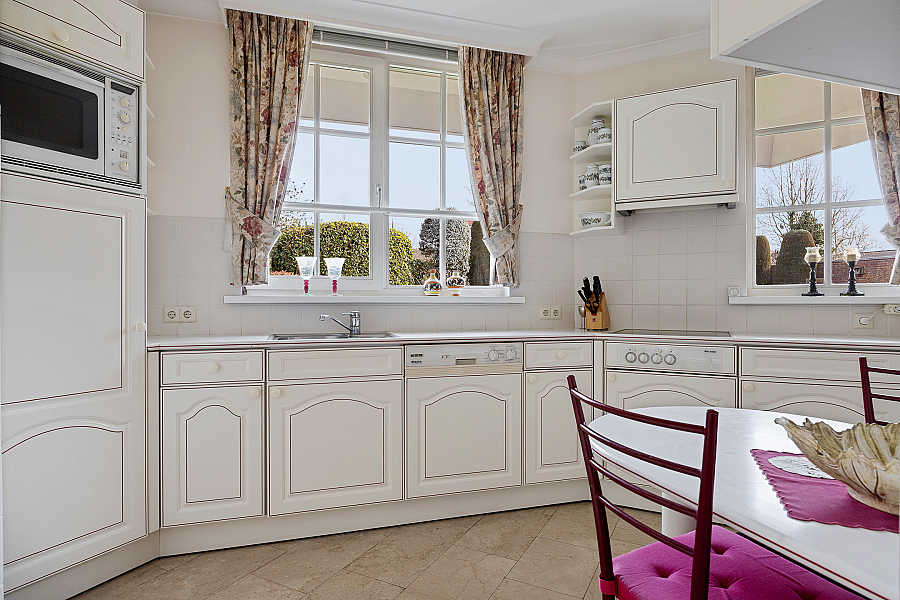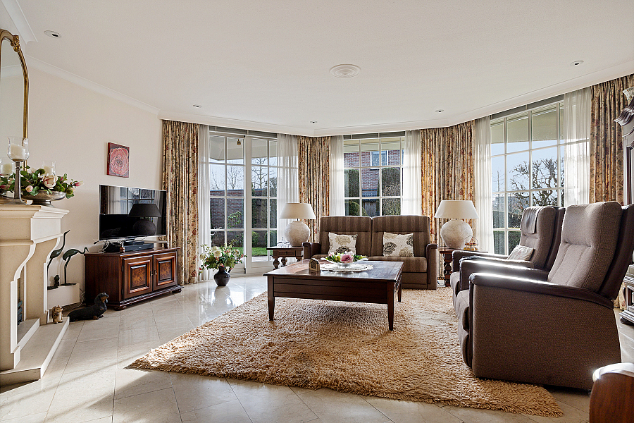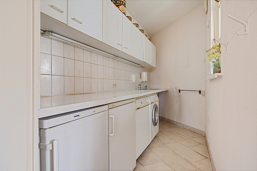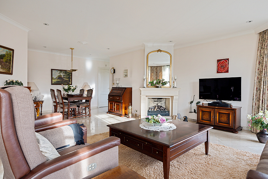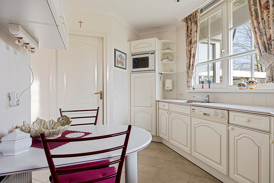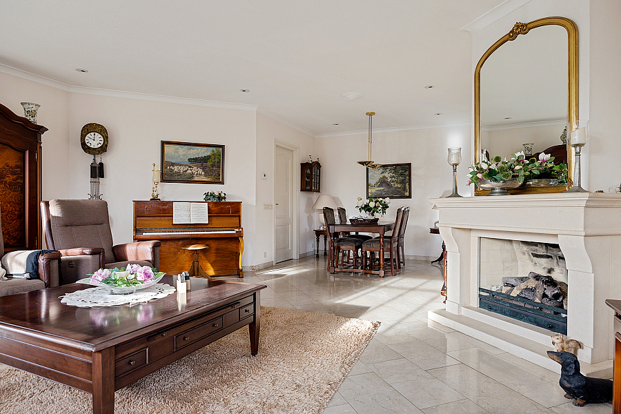 De woonkamer is licht en ruim, voorzien van een gashaard en een schuifpui naar de tuin. De travertinvloer is uitgevoerd met vloerverwarming, in de woonkeuken is ruimte voor een extra eethoek en aansluitend ligt de bijkeuken met vaste kasten, een aanrecht met spoelbak, boiler en aansluitingen voor wasapparatuur.