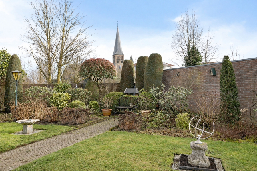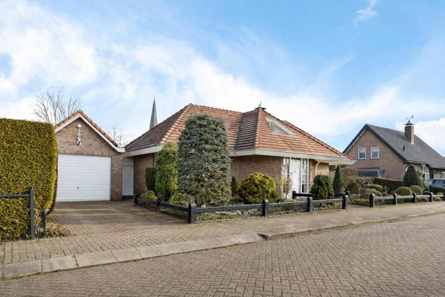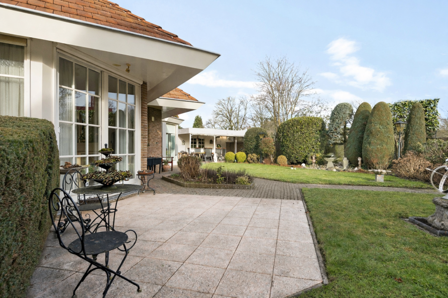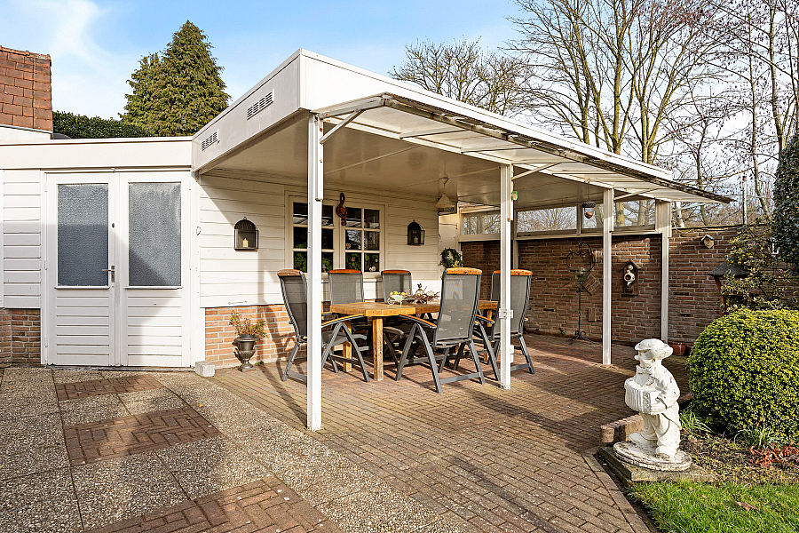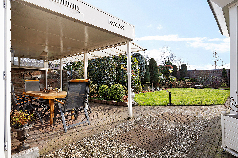 Rondom de woning ligt een verzorgde tuin met meerdere zitplekken en een prettige mate van privacy. Via een overkapping is de geïsoleerde en verwarmde garage bereikbaar. Deze beschikt over een zolder en een hobbyruimte met wateraansluiting. Verder zijn er een berging met wastafel en radiator, een tuinschuur en een extra overkapping aanwezig.