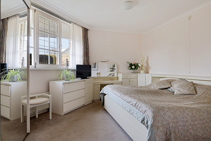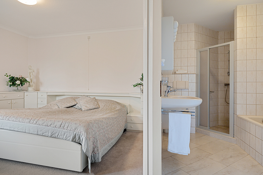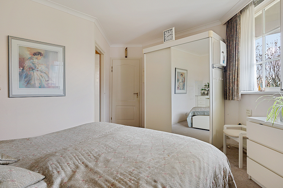 De slaapkamer op de begane grond beschikt over een aangrenzende badkamer met ligbad, douchecabine, wastafel en toilet. Daarnaast is er een serre aanwezig, voorzien van vloerverwarming en een schuifpui, die zorgt voor extra leefruimte met zicht op de tuin.