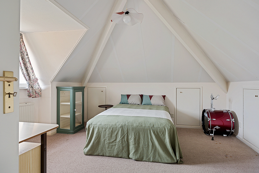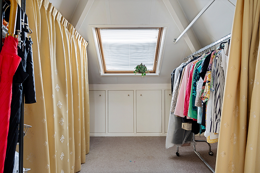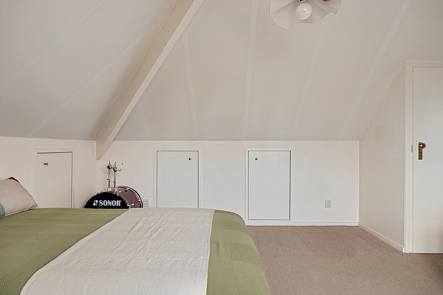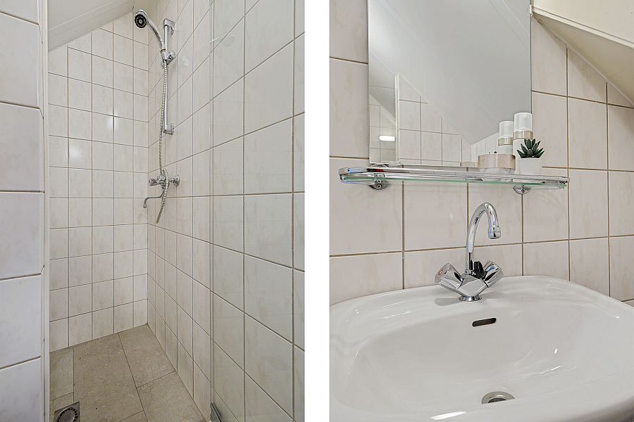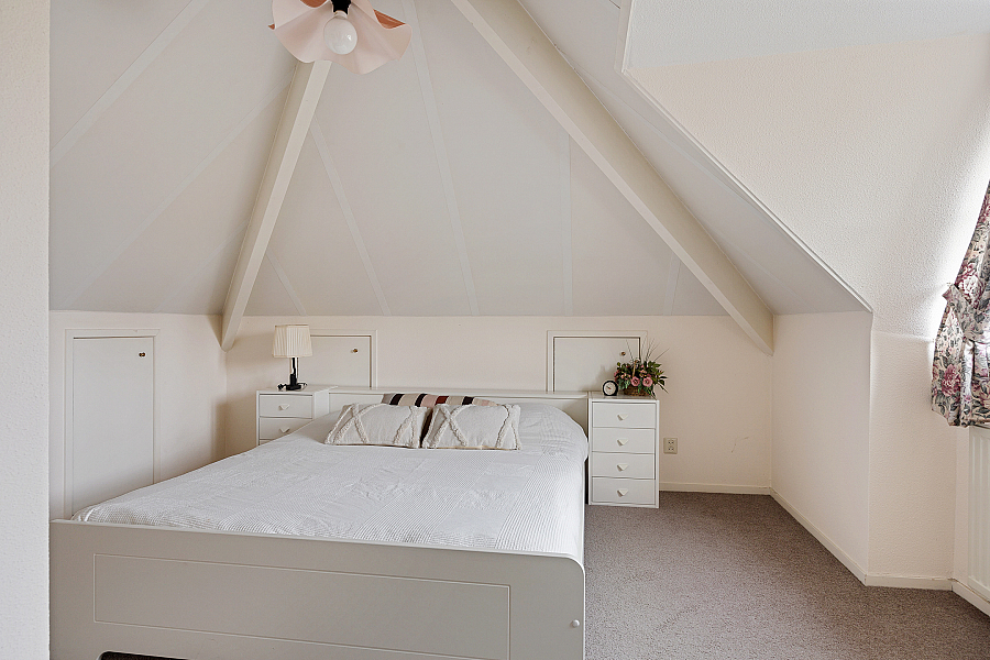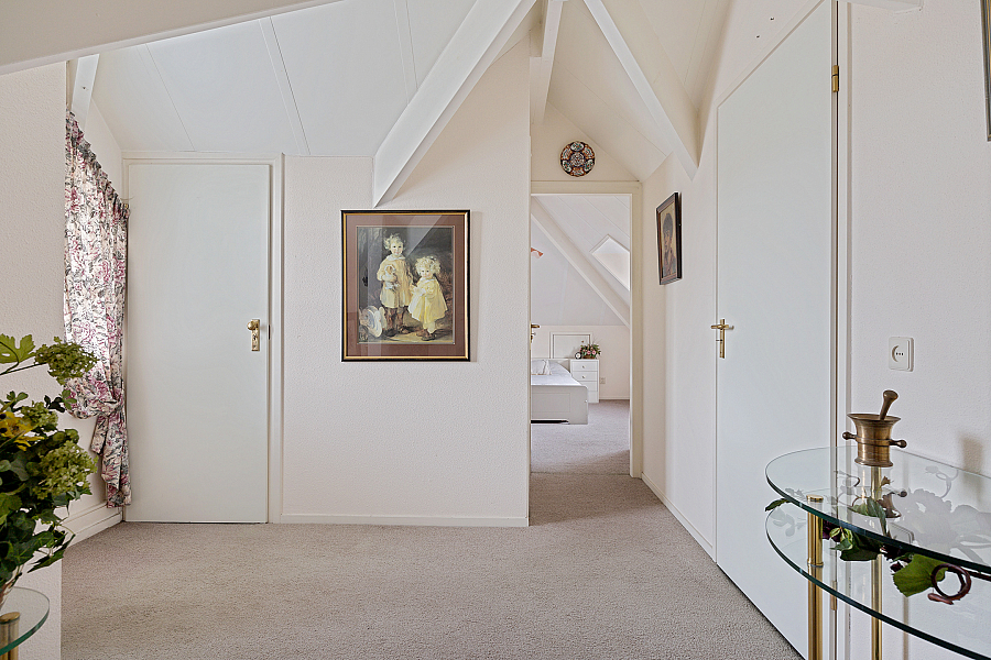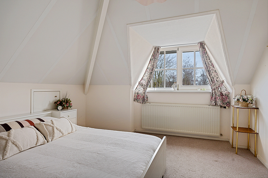 1e verdieping: overloop met vaste kast, loggia, 3 slaapkamers met vaste kasten en knieschotten voor bergruimte, badkamer met wastafel, douche en toilet.