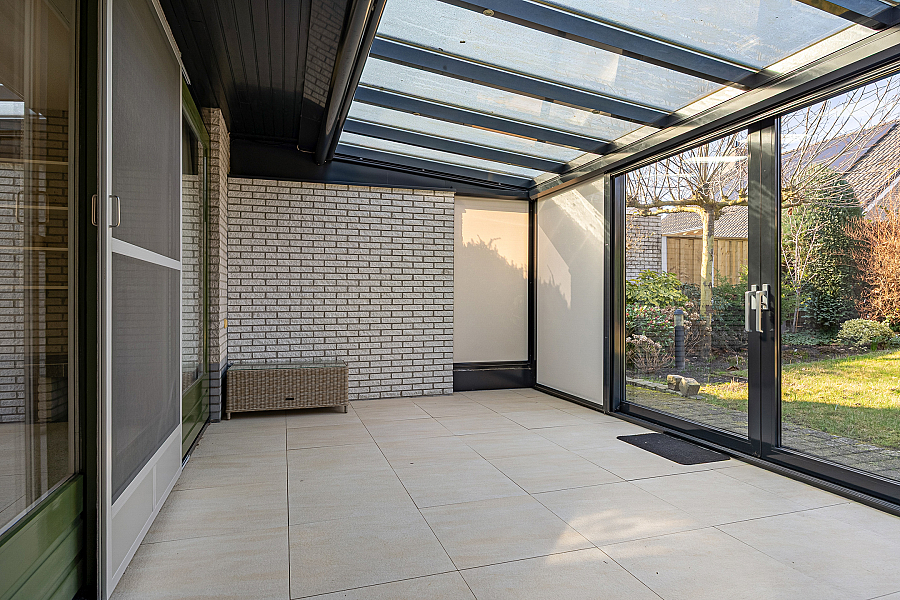 * Serre met glazen dak en schuifpui naar de tuin;