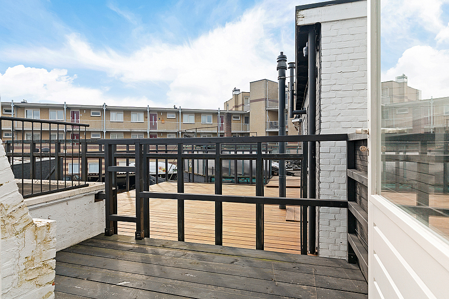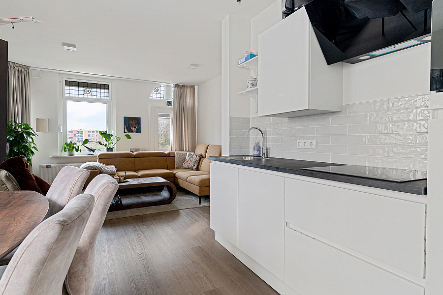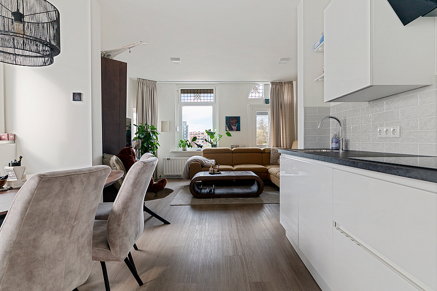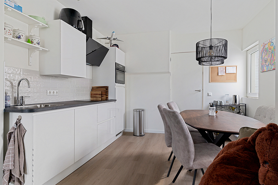 De keuken is modern en volledig vernieuwd, met diverse inbouwapparatuur zoals een vaatwasser, inductiekookplaat, combimagnetron en afzuigkap. Vanuit de woonkamer heeft u toegang tot het balkon, een fijne plek om even buiten te zitten.