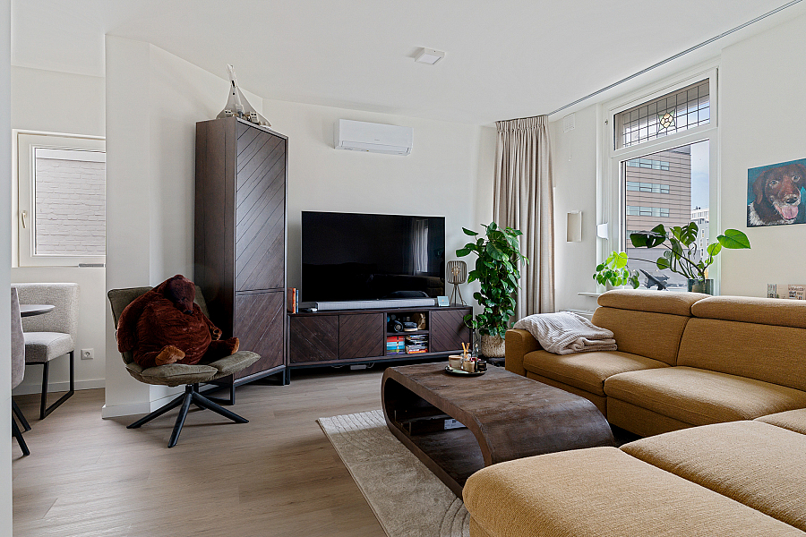 Via de zij-ingang op de begane grond bereikt u via de gedeelde trapopgang het appartement. Eenmaal binnen valt direct de lichte en verzorgde uitstraling op. De woonkamer met open keuken vormt een prettige leefruimte waar u zich snel thuis zult voelen. De airconditioning zorgt hier voor extra comfort, ook tijdens warme dagen.