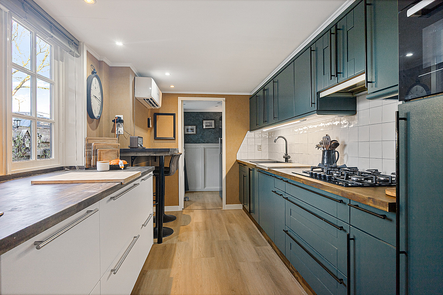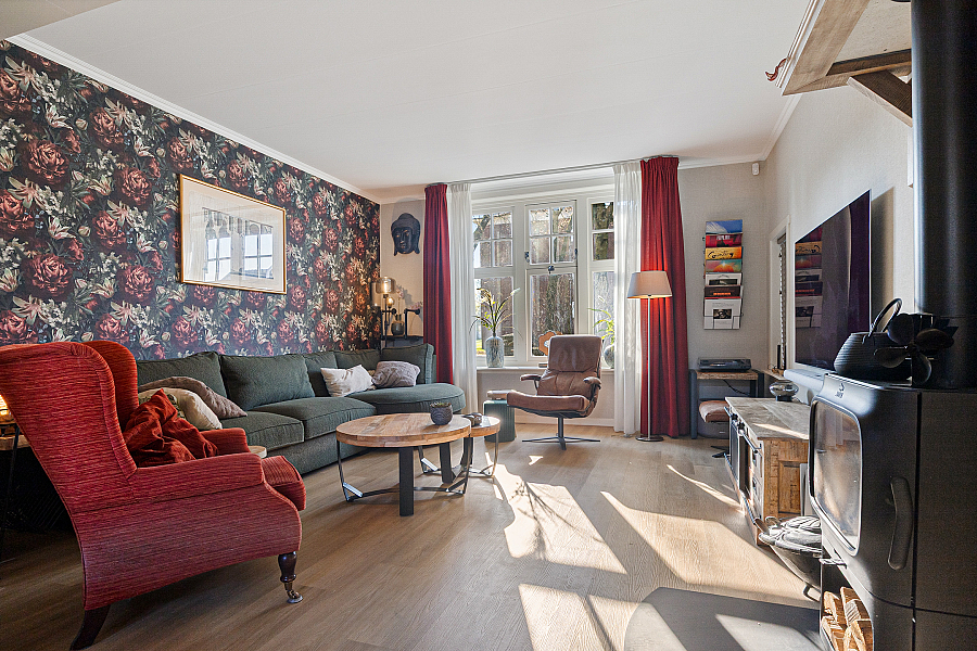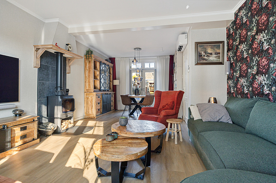 Entree in de hal met meterkast, toilet met fontein, trapkast en trapopgang naar de eerste verdieping. De doorzonwoonkamer van circa 35 m² is heerlijk licht en heeft een sfeervolle houtkachel met schouw. De ruime dichte keuken is modern uitgevoerd en voorzien van een gaskookplaat, afzuigkap, combimagnetron, vaatwasser, heet waterkraan en is voorzien van airconditioning. Vanuit de keuken bereikt u de bijkeuken met wasmachineaansluiting, cv-opstelplaats en deur naar de tuin.