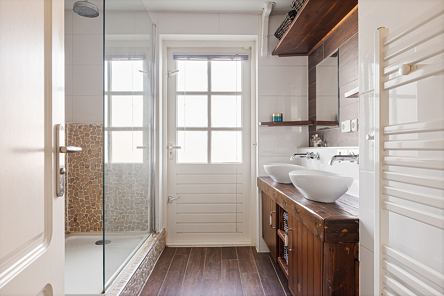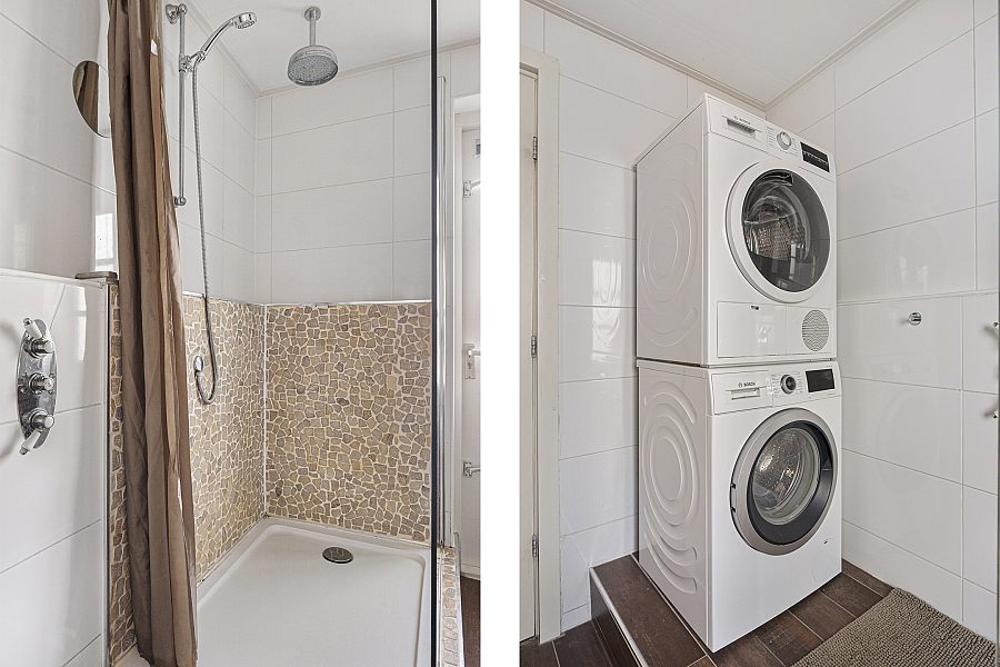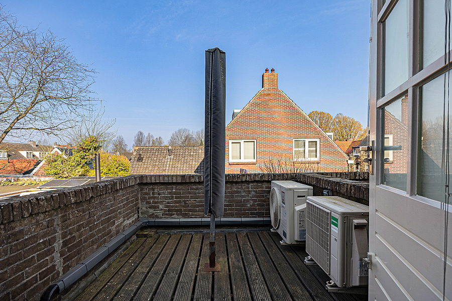Royale overloop met airconditioning, twee ruime slaapkamers (voorheen 3 slaapkamers) met vaste kastruimte, een dakterras en een badkamer met douchecabine en wastafelmeubel met dubbele wasbak.