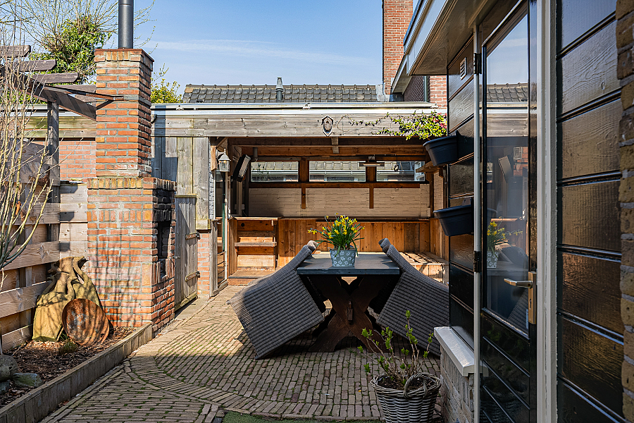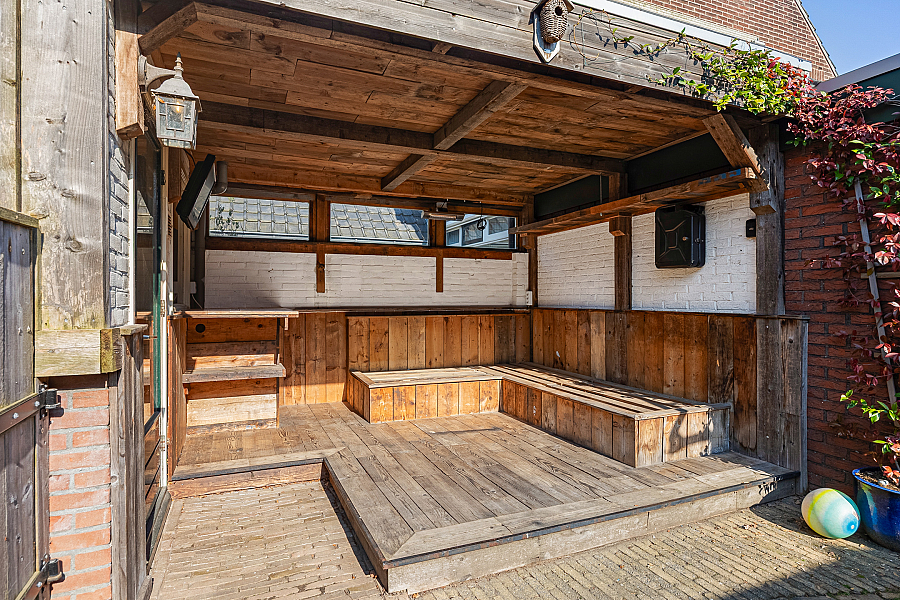 De achtertuin is verzorgd aangelegd en beschikt over meerdere terrassen, een achterom, een buitenhaard, fietsenberging en een vrijstaande stenen berging met overkapping.