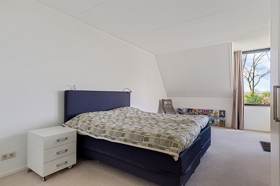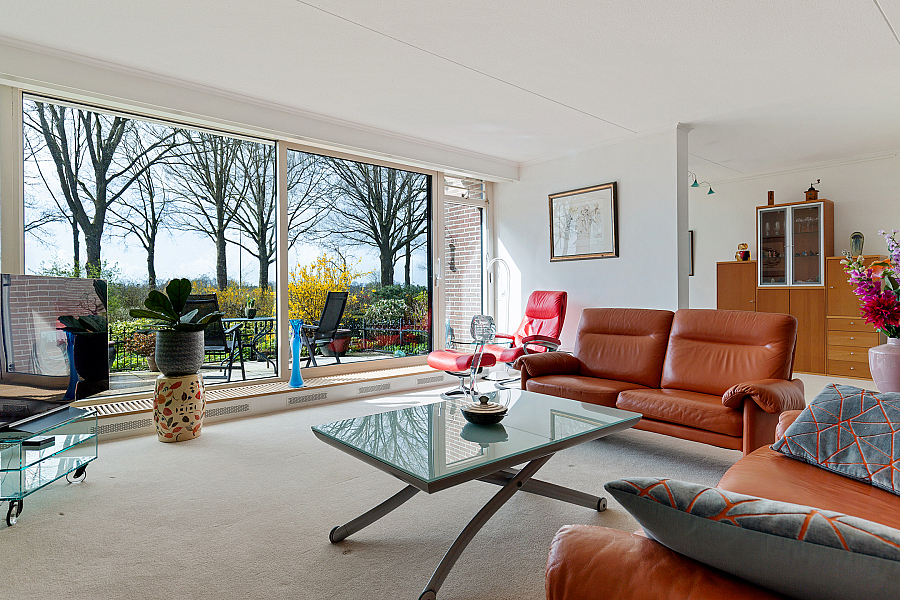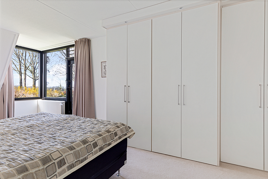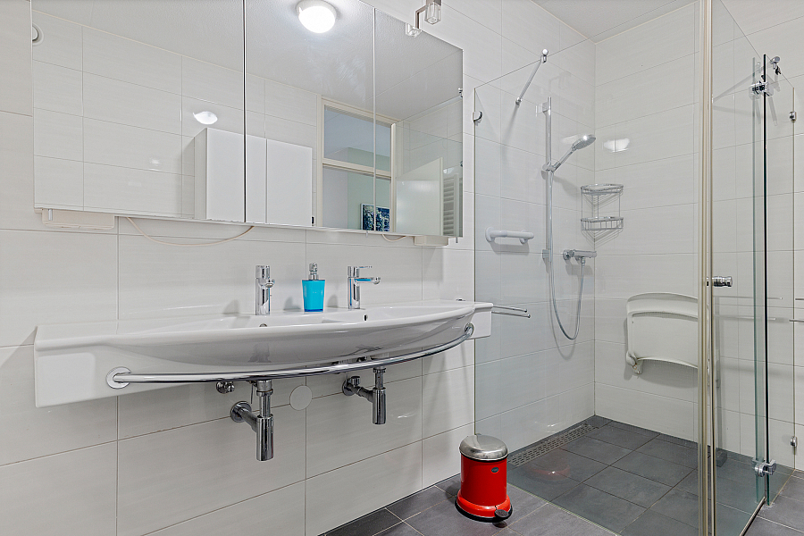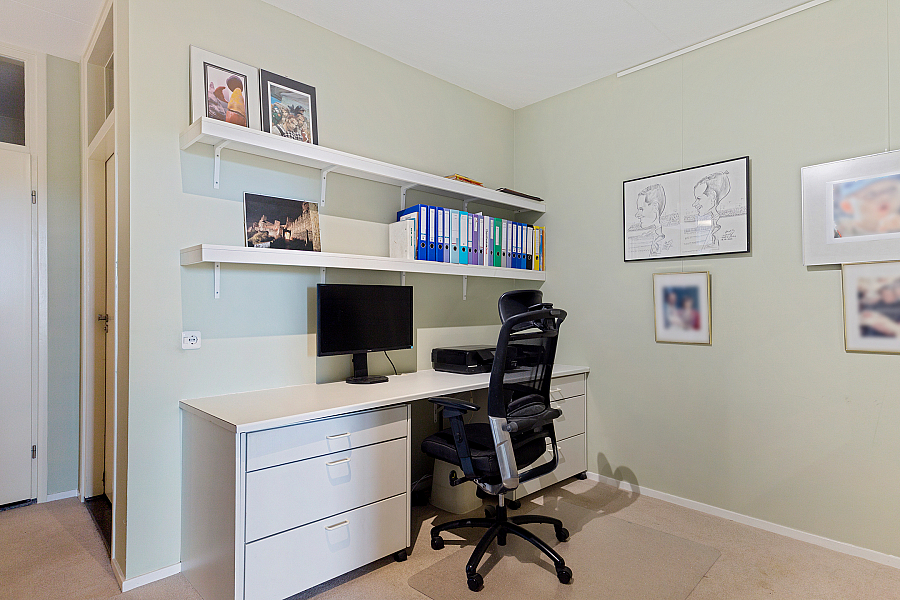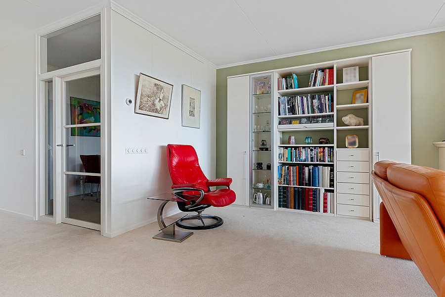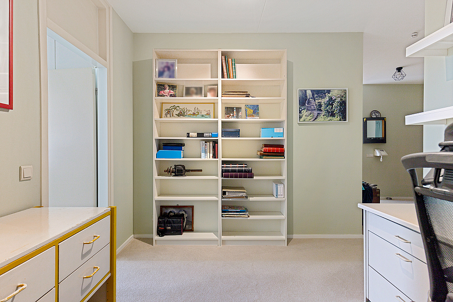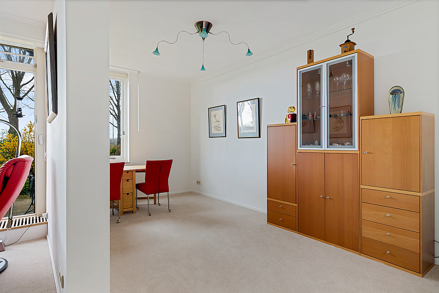 Verder beschikt het appartement over een ruime badkamer met vloerverwarming, een werk-/hobbyruimte en een zeer royale slaapkamer met luxe inbouwkasten. Via de grote schuifpui in de woonkamer loop je zo het zonnige terras op. Dit terras grenst direct aan de tuin van het complex en biedt een fraai uitzicht over de Twickelse Es.