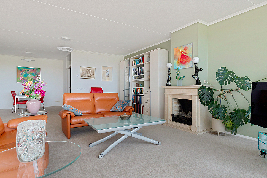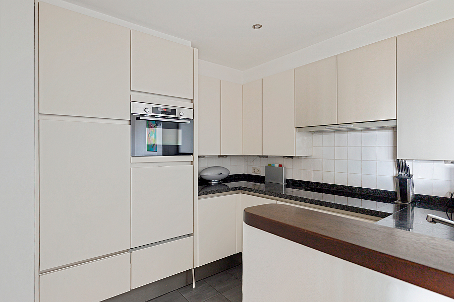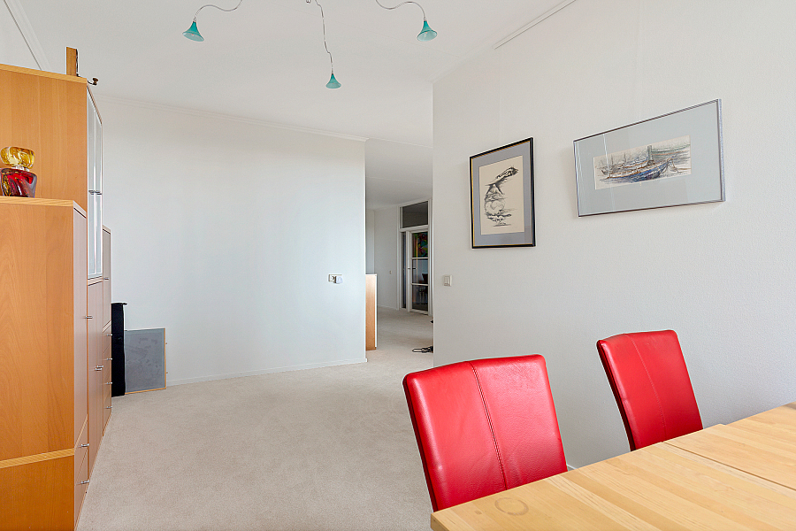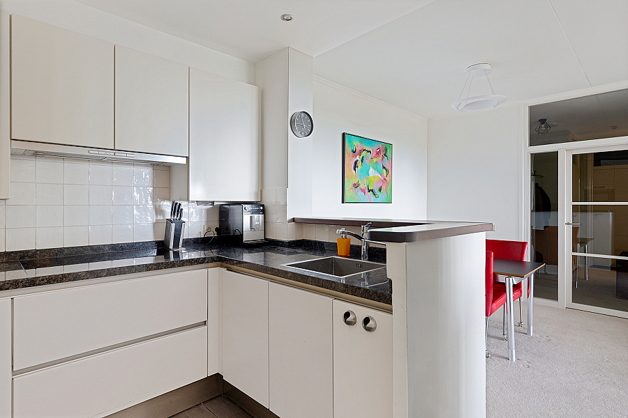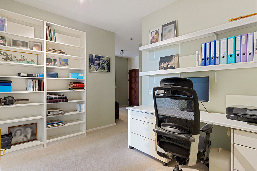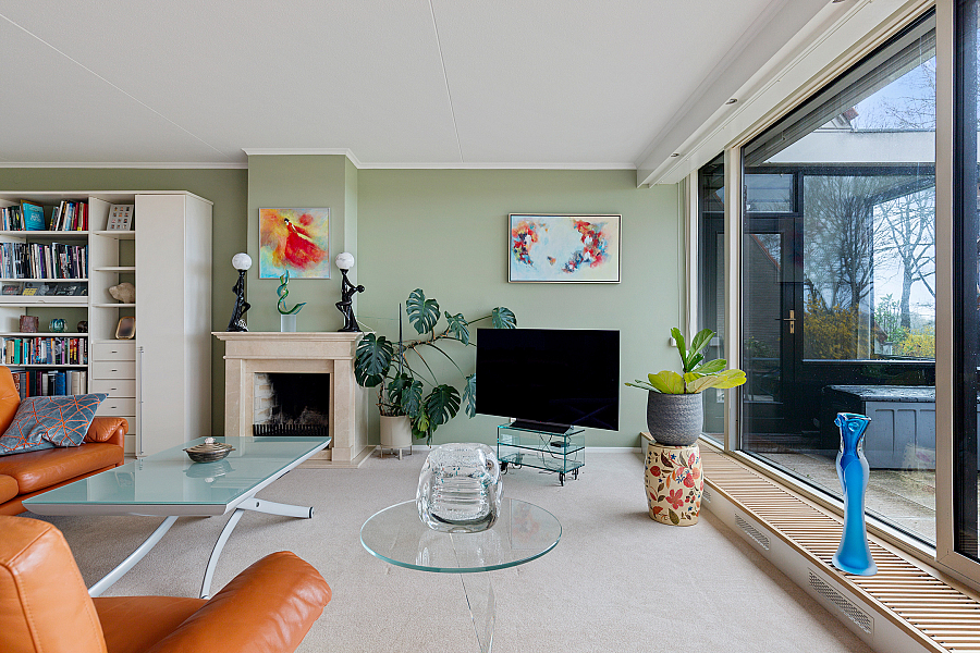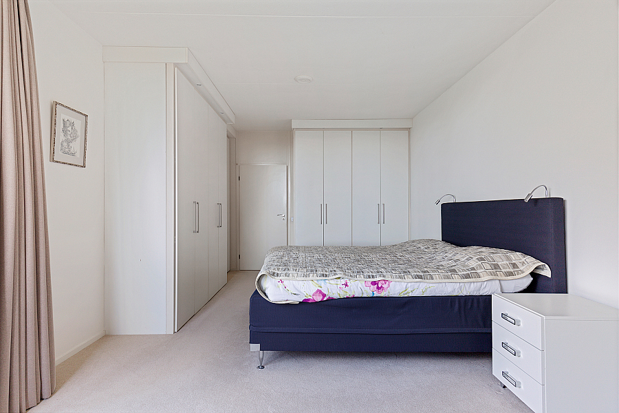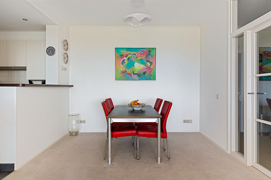 Verder beschikt het appartement over een ruime badkamer met vloerverwarming, een werk-/hobbyruimte en een zeer royale slaapkamer met luxe inbouwkasten. Via de grote schuifpui in de woonkamer loop je zo het zonnige terras op. Dit terras grenst direct aan de tuin van het complex en biedt een fraai uitzicht over de Twickelse Es.