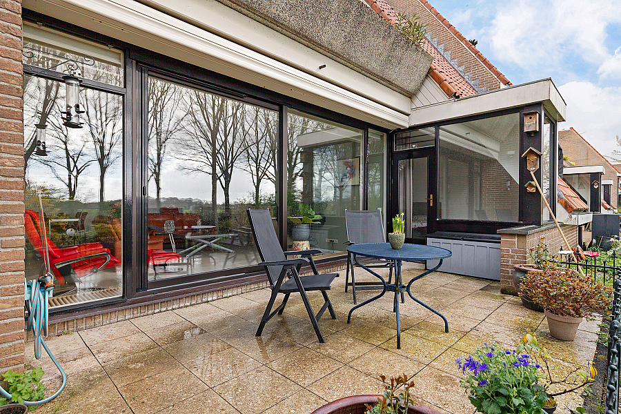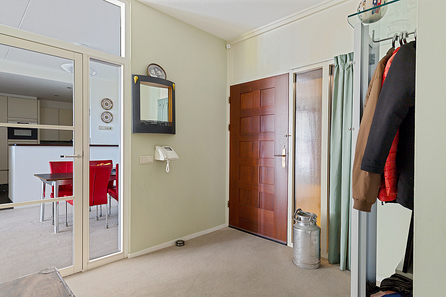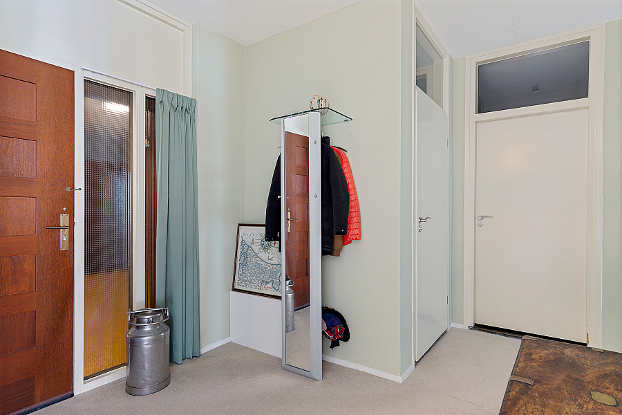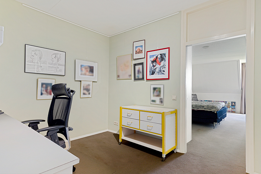 Entree, hal, toilet, royale woonkamer met schouw, schuifpui en zijkamer, halfopen keuken, praktische bijkeuken, badkamer met inloopdouche, tweede toilet en dubbele wastafel, werk-/hobbyruimte en een grote slaapkamer met inbouwkasten.