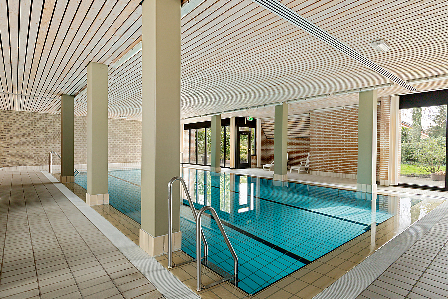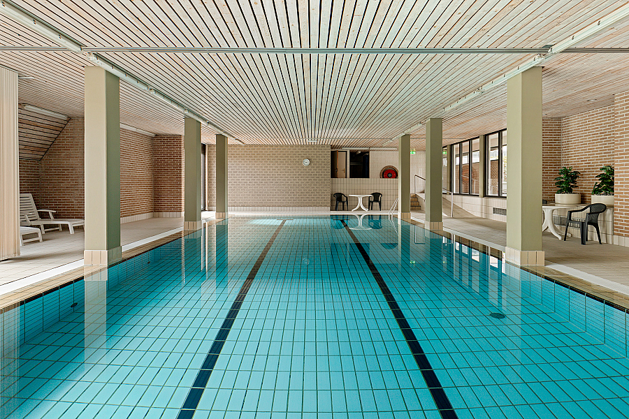 Centrale entree met hal en toegang tot diverse faciliteiten, waaronder het zwembad en de sauna.