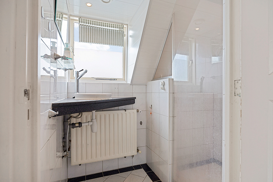 Overloop, twee slaapkamers en de badkamer. De badkamer is voorzien van een douche en wastafel.